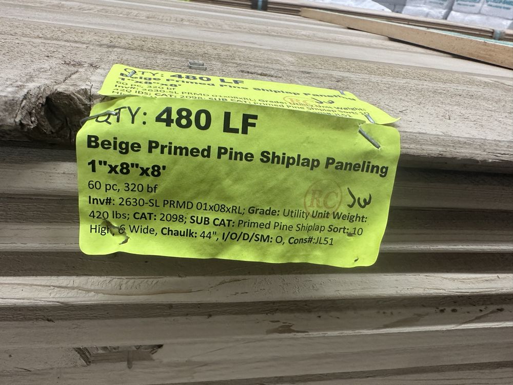 Beige Primed Pine Shiplap Paneling 1"x8"x8'. 60 Pieces, 320 Board Foot, Grade: Utility . Weight: 420. Sold by: Linear Foot. Sold as: Price X Quantity. Inventory #: 2630-SL PRMD 01x08xRL