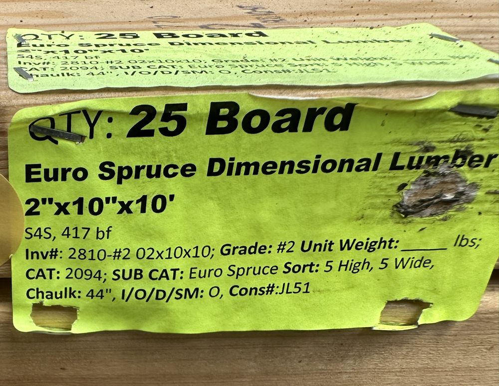 Euro Spruce Dimensional Lumber 2"x10"x10'. S4S, 417 Board Foot Grade: #2. Weight: x. Sold by: Board. Sold as: Price X Quantity. Inventory #: 2810-#2 02x10x10