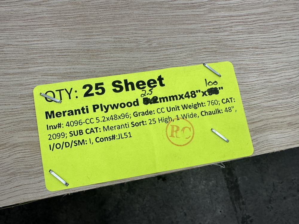 Meranti Plywood 2.5mmx48"x100". Plywood, Grade: CC Note: The photos presented are an illustration of a standard pack of Meranti Plywood. Weight: 760. Sold by: Sheet. Sold as: Price X Quantity. Inventory #: 4096-CC 5.2x48x96