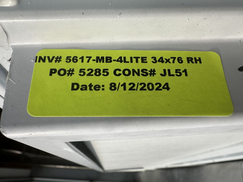 Exterior Mobile Home Door 4 Lite 34"x76" Right Hand. Fiberglass, Pre-Hung, Actual Dimensions 36 1/4"x78 5/8" 4 9/16" Jamb, Grade: B. Weight: 80. Sold by: Door. Sold as: Price X Quantity. Inventory #: 5617-MB-4LITE 34x76 RH