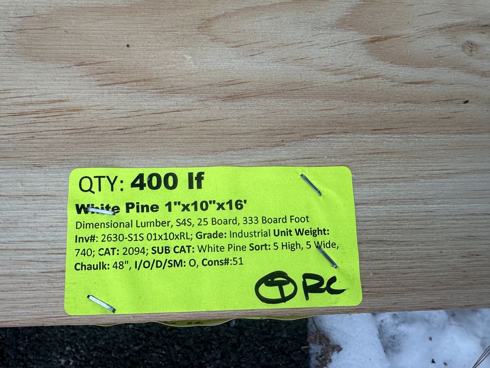 White Pine Dimensional Lumber 1"x10"x16'. S4S, 25 Boards, 333 Board Foot, Grade: Industrial. Weight: 740. Sold by: Linear Foot. Sold as: Price X Quantity. Inventory #: 2630-S1S 01x10xRL