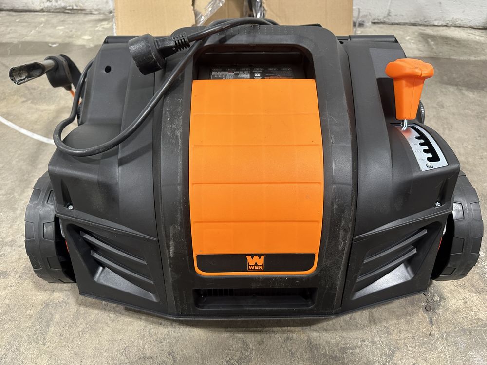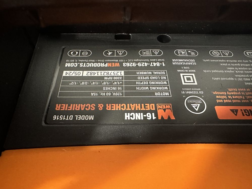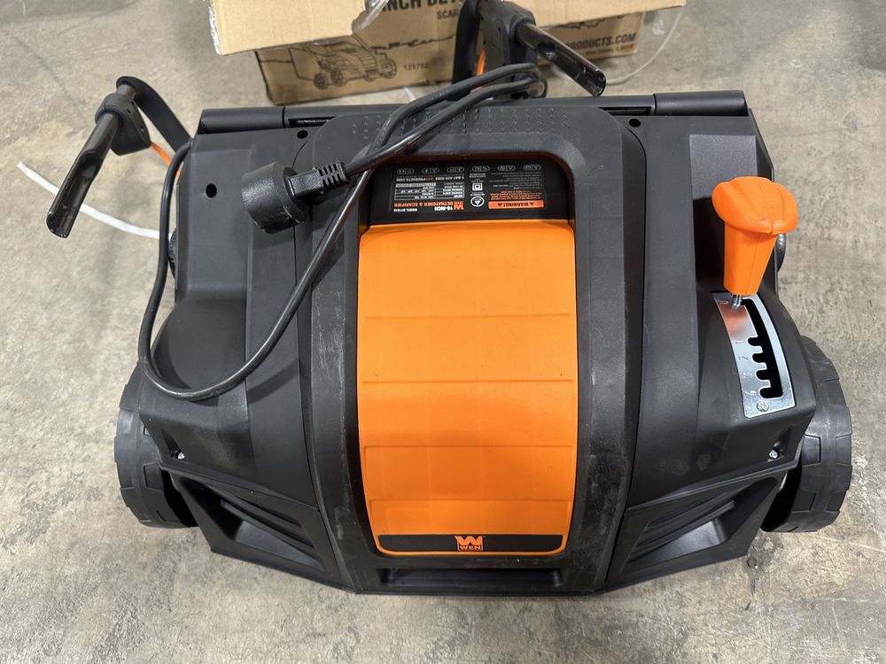 WEN DT1516 16-Inch 15-Amp 2-in-1 Electric Dethatcher and Scarifier with Collection Bag. Light Use. May be missing small hardware pieces. 5-position height adjustment ranges from a +1/4 to -1/2-inch raking depth Powerful 13-amp electric motor generates up to 3300 RPM with a 15-inch clearing path 16-blade scarifying head helps aerate your grass for a healthier and thicker lawn Dethatching head features 24 steel tines for maximum thatch pickup, allowing your soil better access to nutrients, air, and water Features a detachable thatch collection bag, automatic overload shutdown to protect the motor, a scarifying head, a dethatching head. Weight: . Sold by: . Sold as: Price X Quantity. Inventory #: