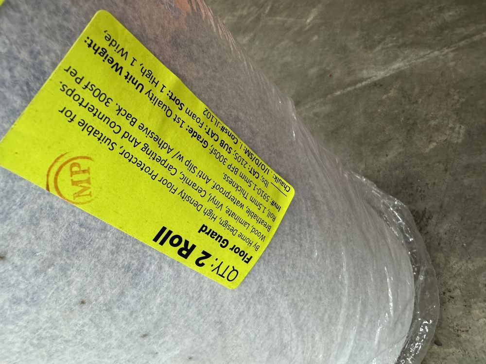 Floor Guard. By Home Design, High Density Floor Protector, Suitable For Wood, Laminate, Vinyl, Ceramic, Carpeting And Countertops, Breathable, Waterproof, Anti-Slip W/Adhesive Back, 300 Square Foot Per Roll, 1.5mm Thickness, Grade: 1st Quality. Weight: x. Sold by: Roll. Sold as: Price X Quantity. Inventory #: 5910-1.5mm BFP 300sf