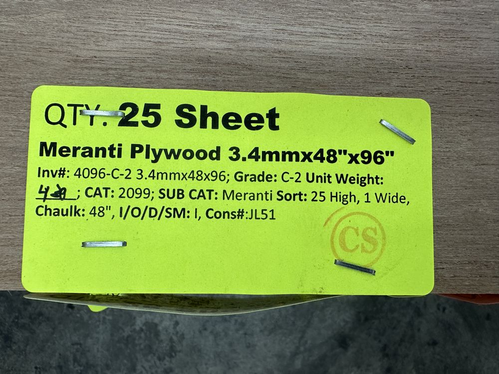 Meranti Plywood 3.4mmx48"x96". Grade: C-2. The photos presented are an illustration of a standard pack of 3.4mmx48"x96 Meranti Plywood. Weight: 430. Sold by: Sheet. Sold as: Price X Quantity. Inventory #: 4096-C-2 3.4mmx48x96
