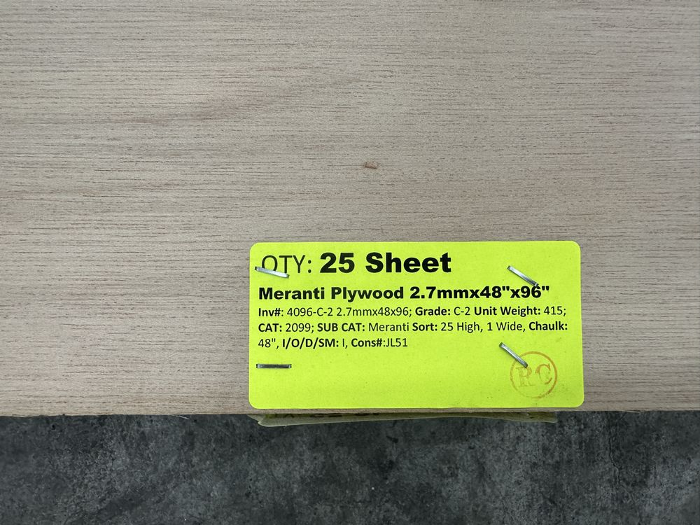 Meranti Plywood 2.7mmx48"x96". Grade: C-2. Weight: 415. Sold by: Sheet. Sold as: Price X Quantity. Inventory #: 4096-C-2 2.7mmx48x96