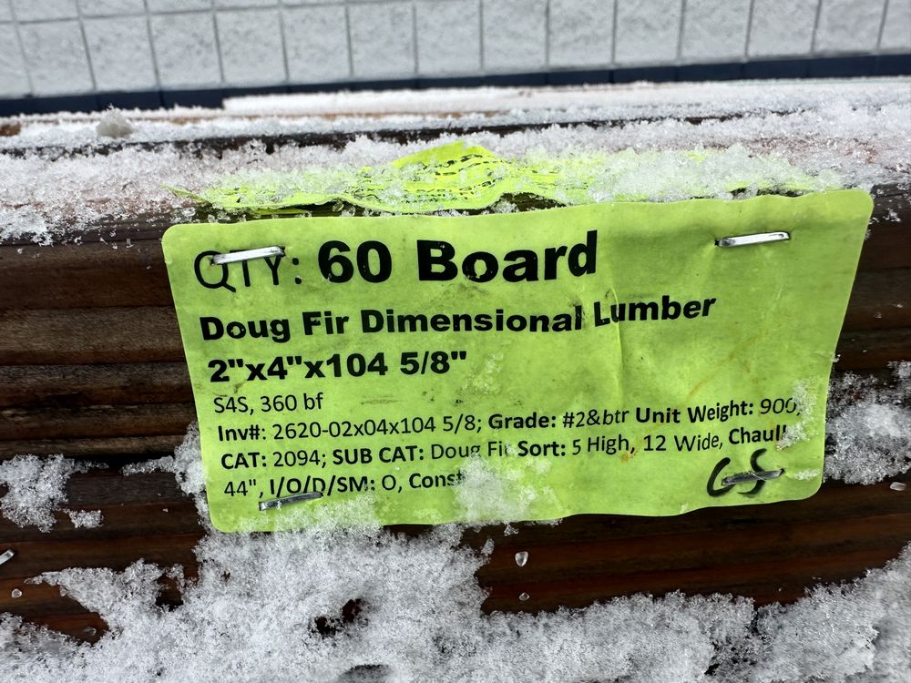 Doug Fir Dimensional Lumber 2"x4"x104 5/8". S4S, 360 Board Foot, Grade: #2&btr. Weight: 950. Sold by: Board. Sold as: Price X Quantity. Inventory #: 2620-02x04x104 5/8