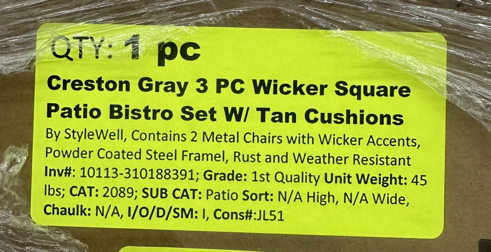 Creston Gray 3 Piece Wicker Patio Bistro Set W/ Tan Cushions. By StyleWell, Contains 2 Metal Chairs With Wicker Accents, Powder Coated Steel Frame, Rust and Weather Resistant, Grade: 1st Quality. Weight: 45. Sold by: Piece. Sold as: Price X Quantity. Inventory #: 10113-310188391