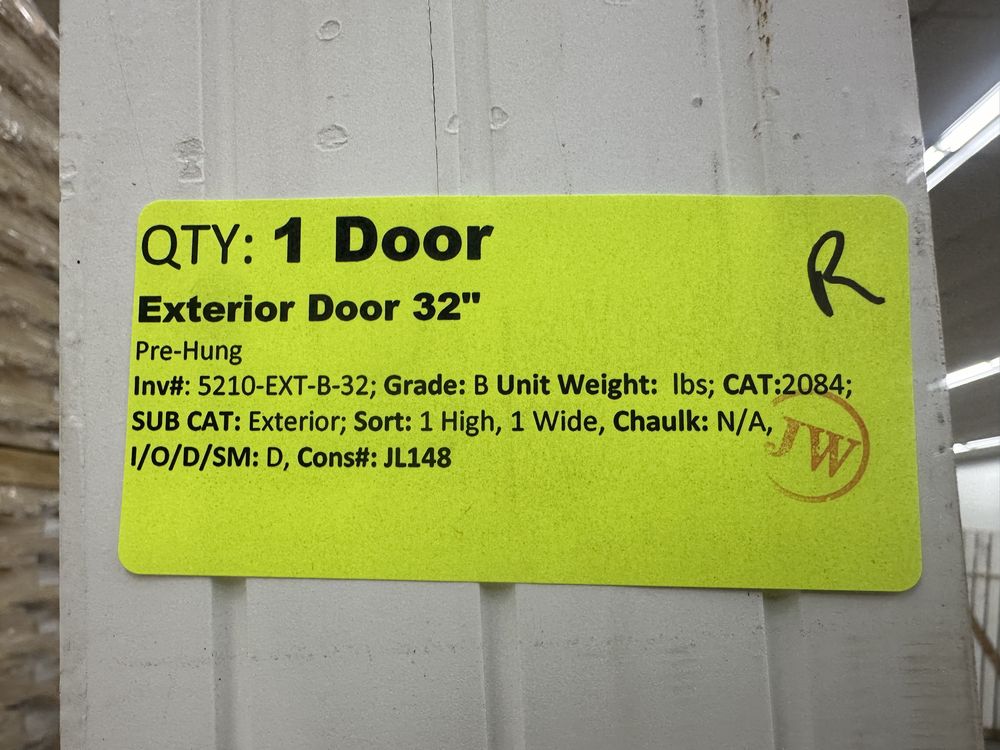 Exterior Door 32" RH. Pre-Hung, Grade: B. Weight: x. Sold by: Door. Sold as: Price X Quantity. Inventory #: 5210-EXT-B-32