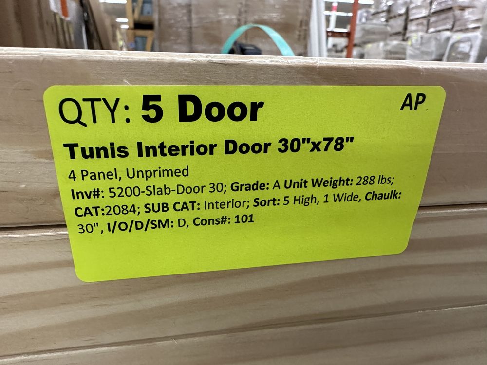 5 Pack Tunis Interior Door 30"x78". 4 Panel, Unprimed, Grade: A. Weight: 288. Sold by: Door. Sold as: Price X Quantity. Inventory #: 5200-Slab-Door 30