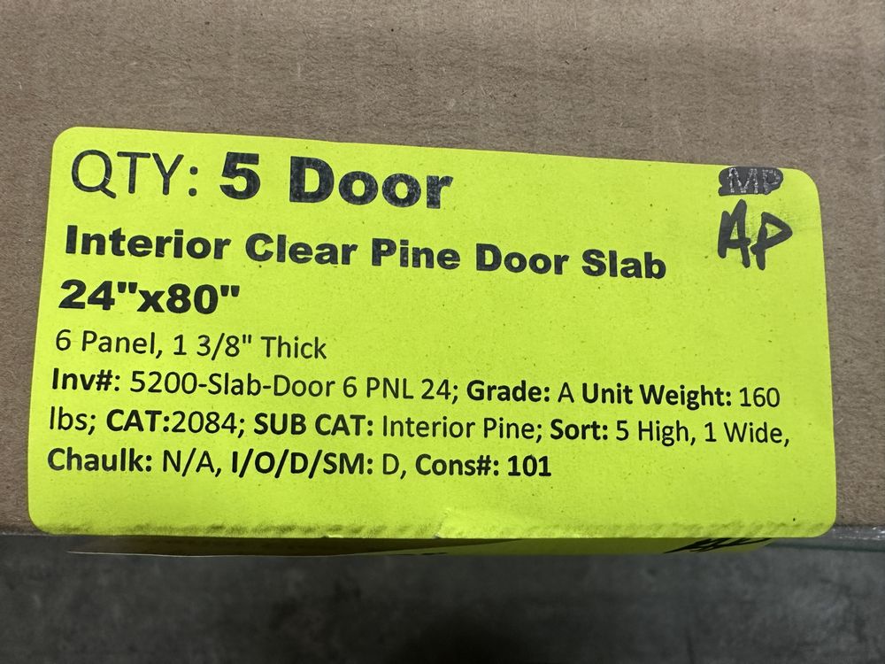 5 Pack Interior Clear Pine Door Slab 24"x80". 6 Panel, 1 3/8" Thick, Grade: A. Weight: 160. Sold by: Door. Sold as: Price X Quantity. Inventory #: 5200-Slab-Door 6 PNL 24