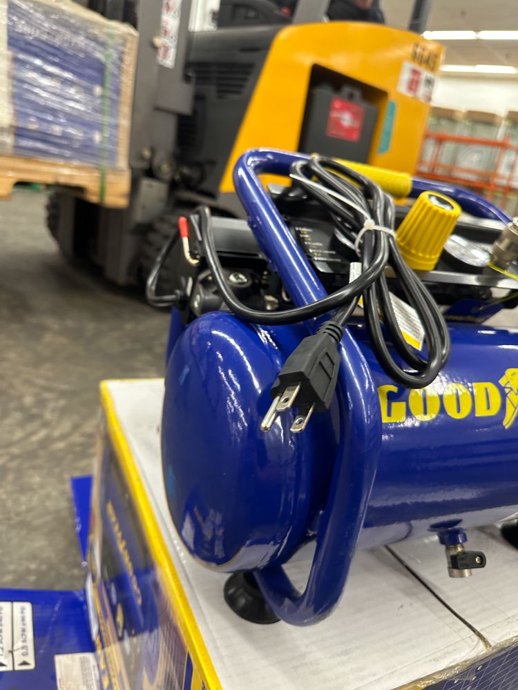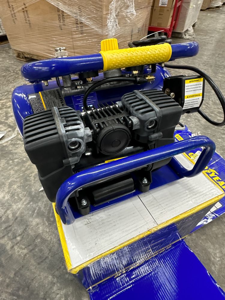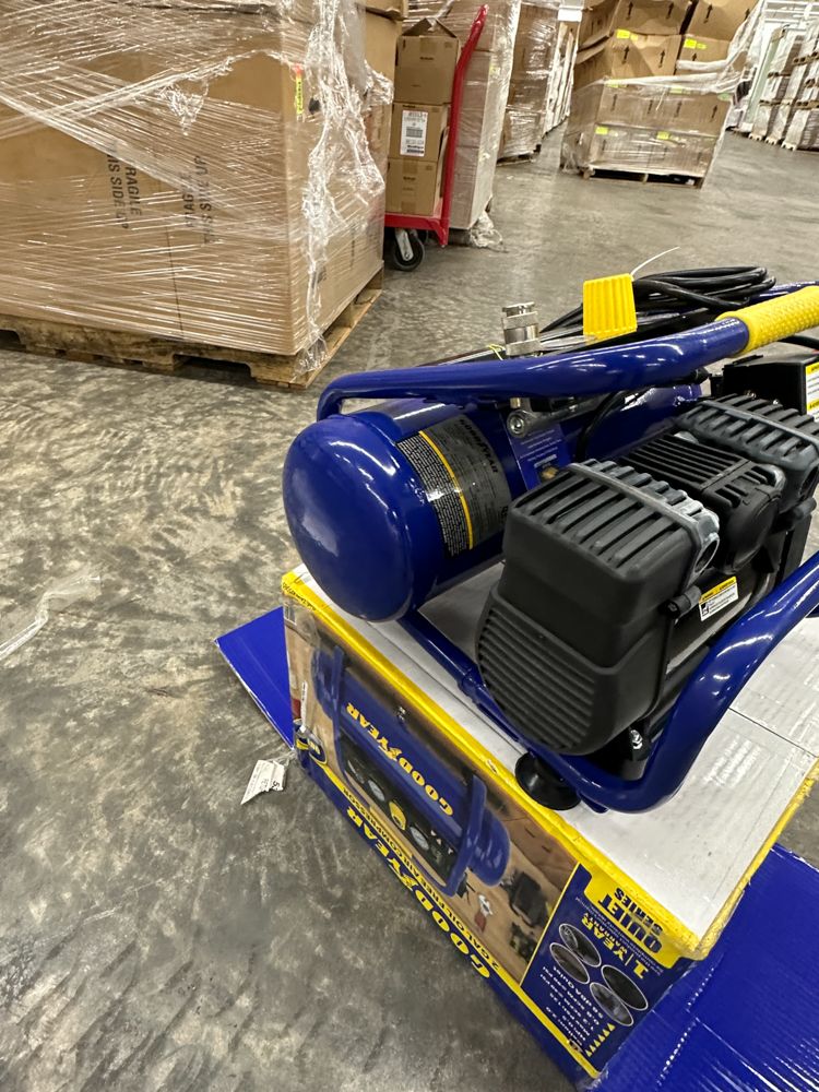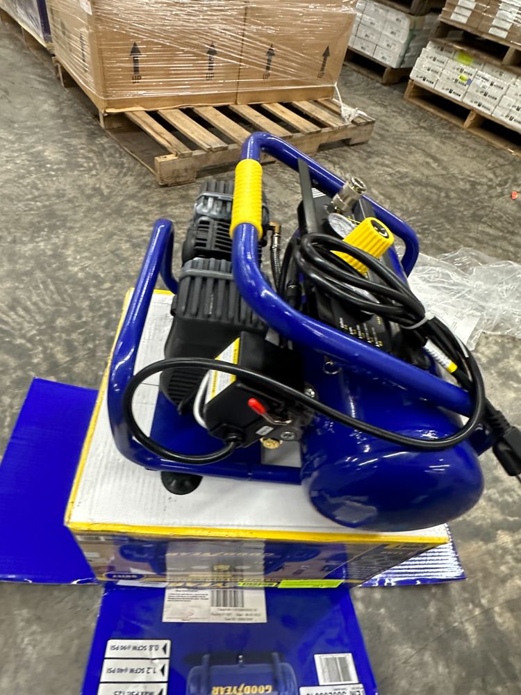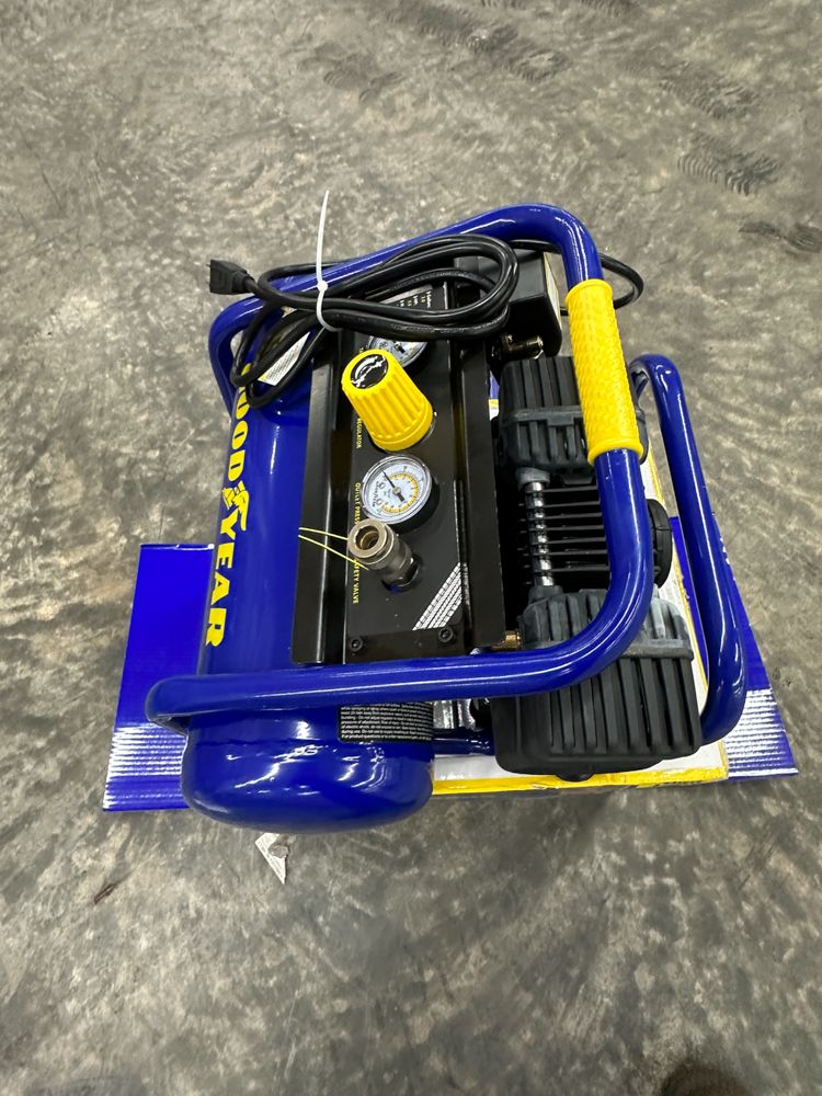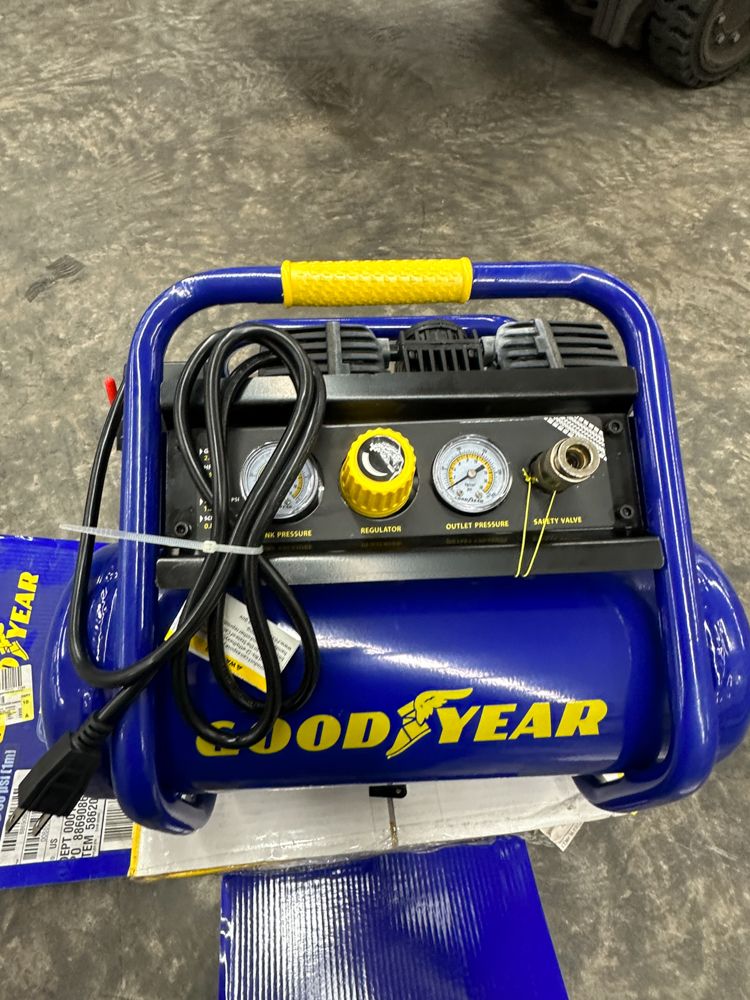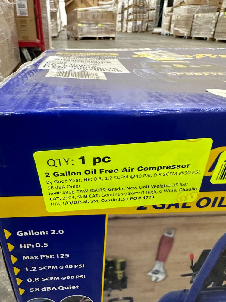 2 Gallon Oil Free Air Compressor. By Good Year, HP: 0.5, 1.2 SCFM @40 PSI, 0.8 SCFM @90 PSI, 58 dBA Quiet, Grade: New. Weight: 35. Sold by: Piece. Sold as: Price X Quantity. Inventory #: 4858-TAW-0508S