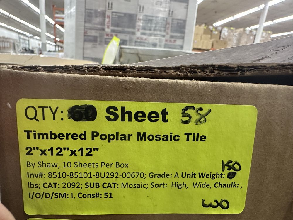 Timbered Poplar Mosaic Tile 2"x12"x12". By Shaw, 5 boxes 10 sheets per box, 1 box sheets per box, 6 boxes total, Grade: A. Weight: X. Sold by: Sheet. Sold as: Price X Quantity. Inventory #: 8510-85101-8U292-00670