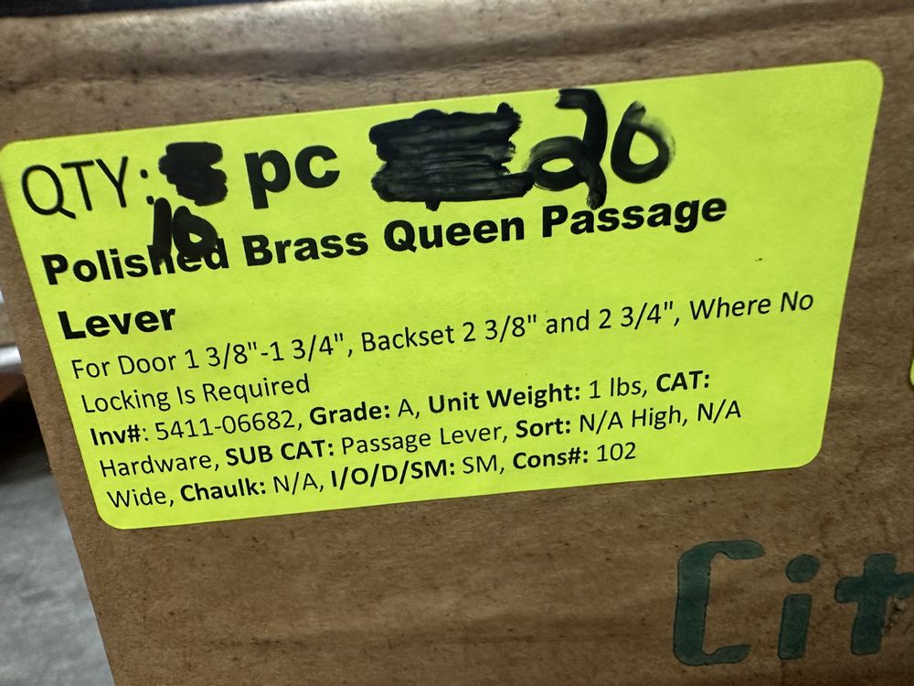 Polished Brass Queen Passage Lever. For Doors 1 3/8"- 1 3/4" Backset 2 3/8" and 2 3/4" Where No Locking Is Required, Grade: A. Weight: 1. Sold by: Piece. Sold as: Price X Quantity. Inventory #: 5411-06682