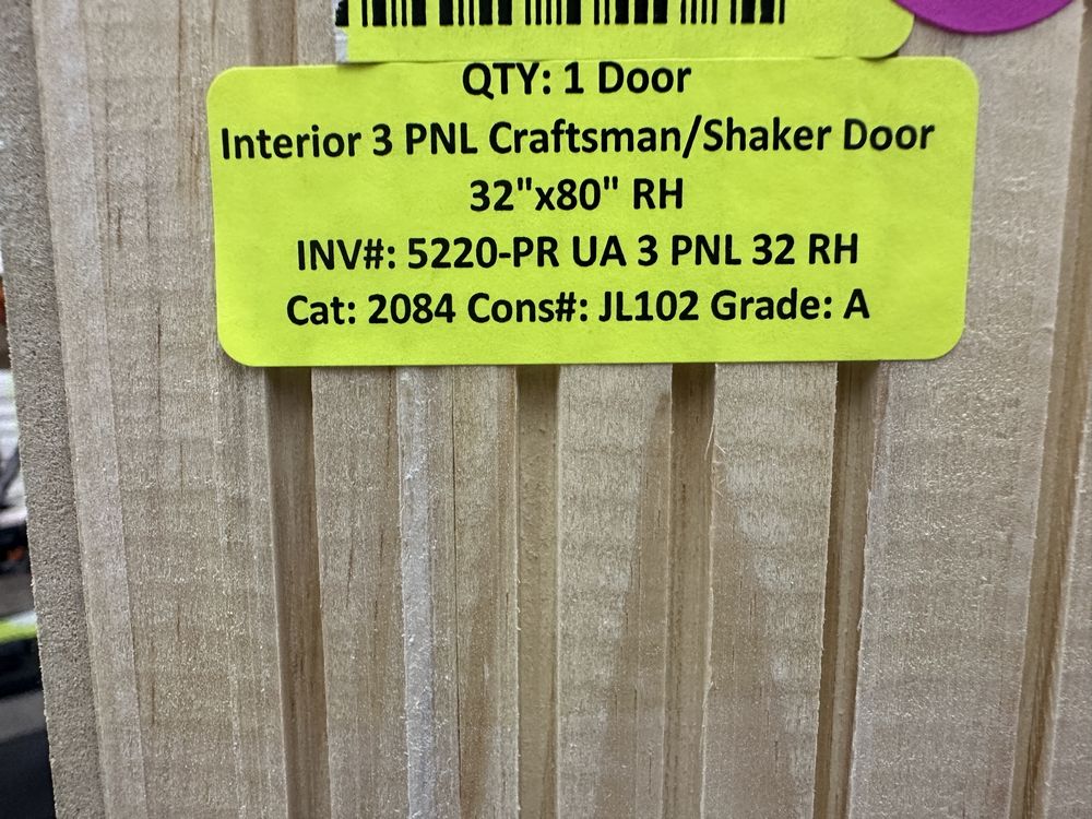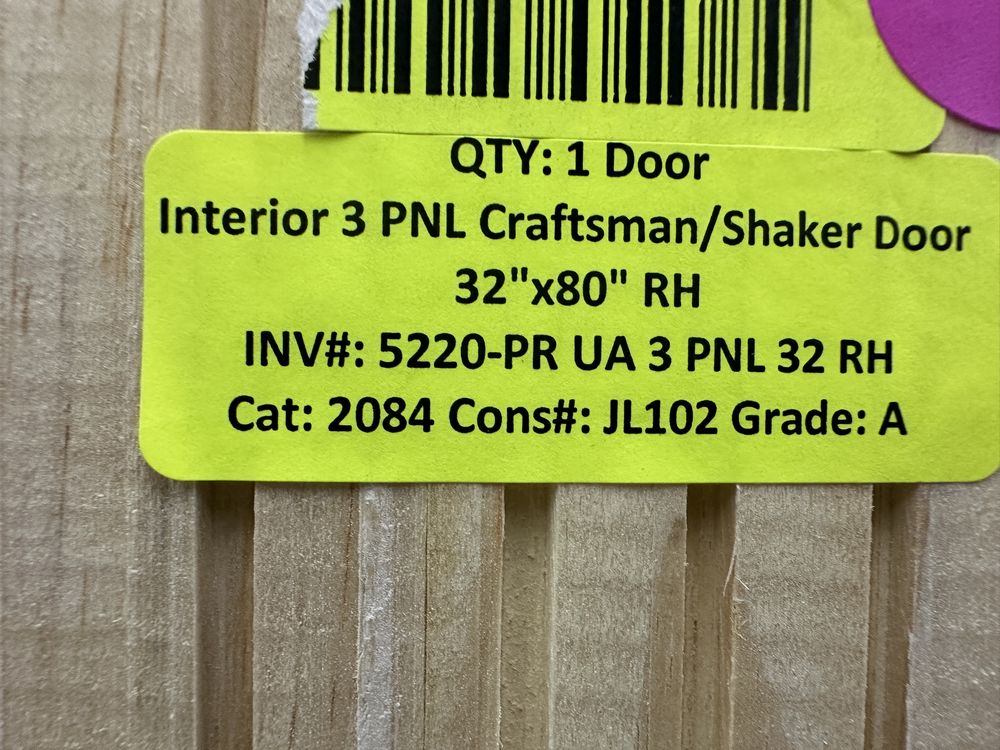 Interior Craftsman/Shaker 3 PNL 32x80 RH. Grade A. Weight: X. Sold by: DOOR. Sold as: Price X Quantity. Inventory #: 5220-PR UA 3 PNL 32 RH
