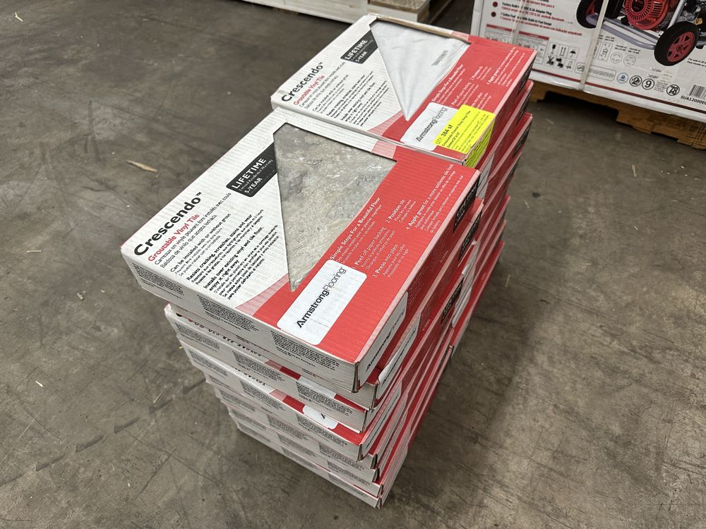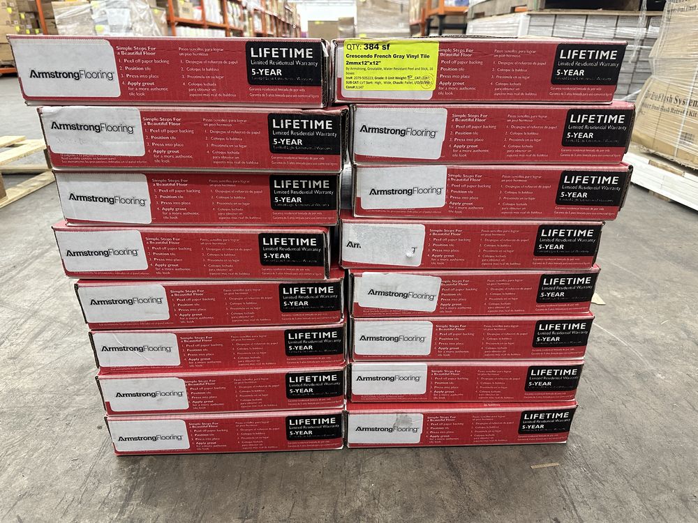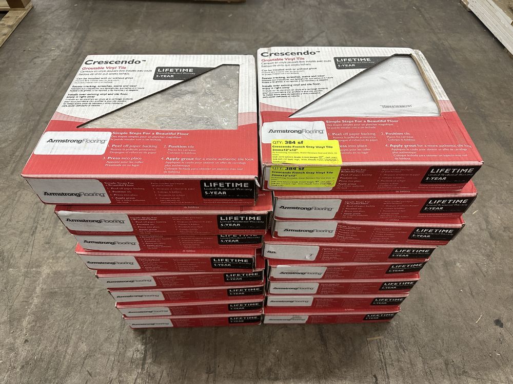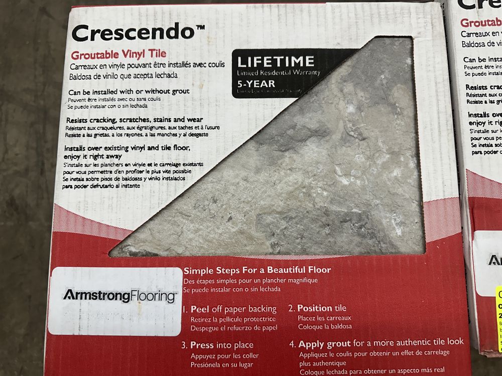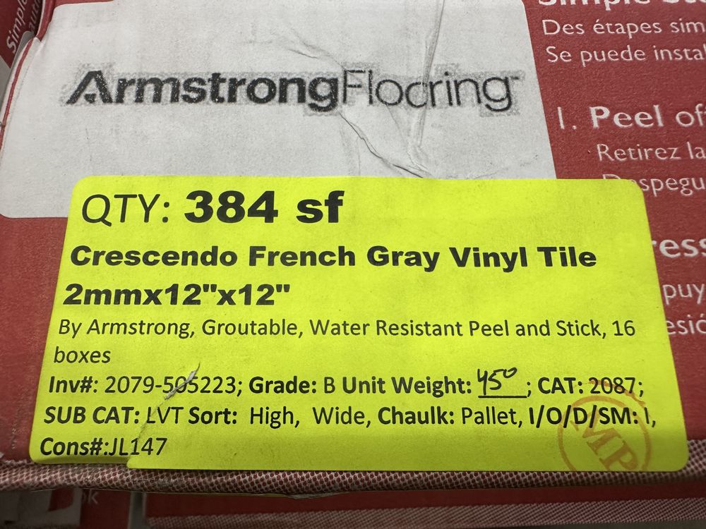 Crescendo French Gray Vinyl Tile 2mmx12"x12". By Armstrong, Groutable, Water Resistant Peel And Stick, 16 Boxes, 24 Pieces Per Box, 24 Square Foot Per Box, Grade: B. Weight: 450. Sold by: Square Foot. Sold as: Price X Quantity. Inventory #: 2079-505223