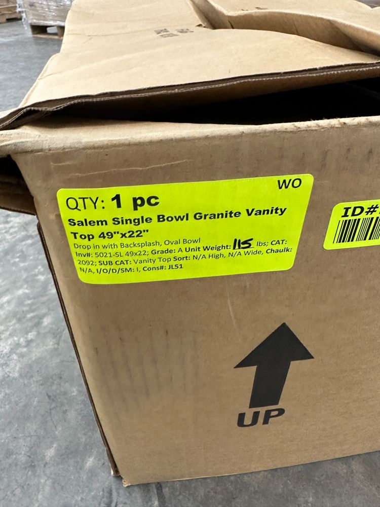 Salem Single Bowl Granite Vanity Top 49"x22". Drop in with Backsplash, Oval Bowl, Grade A. Weight: 115. Sold by: Piece. Sold as: Price X Quantity. Inventory #: 5021-SL-49x22