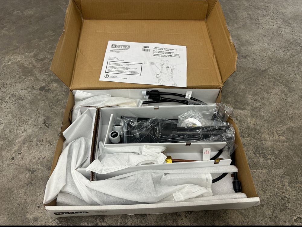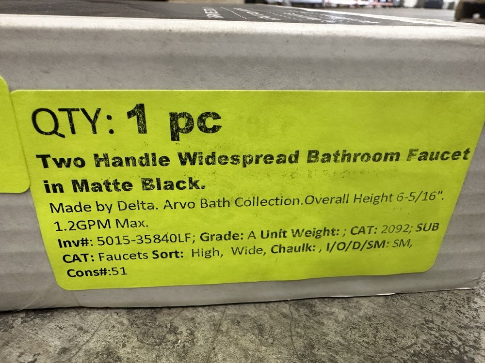 Two Handle Widespread Bathroom Faucet. Matte Black Finish. Made By Delta. Arvo Bath Collection. Overall Height 6-5/16" 1.2GPM Max Grade: A. Weight: x. Sold by: Piece. Sold as: Price X Quantity. Inventory #: 5015-35840LF