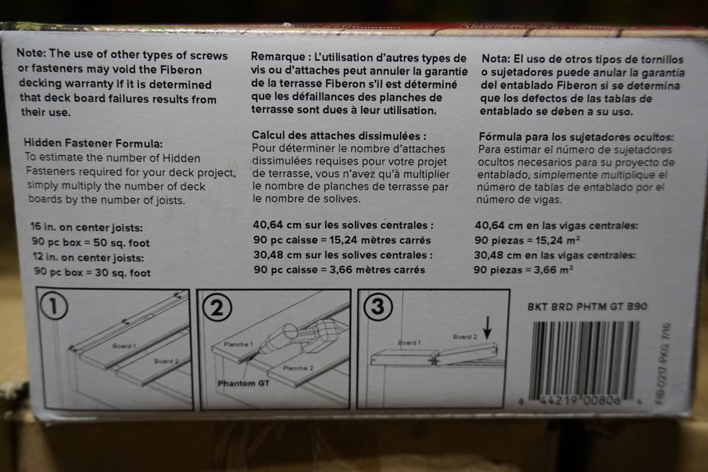Hidden Decking Fasteners. By Fiberon, Includes 80 Line And 10 Butt Joint Fasteners, 95 Screws, 1 Drive Bit, Stainless Steel With Corrosion Resistant Coating, Dual Limiting Tabs For Consistent Spacing, Grade: New. Weight: x. Sold by: Box. Sold as: Price X Quantity. Inventory #: 11012-BOX-0001G