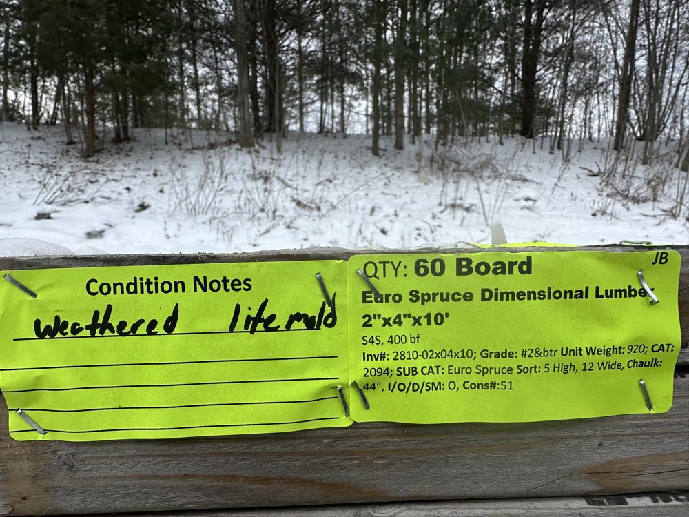 Euro Spruce Dimensional Lumber 2"x4"x10'. S4S, 400 Board Foot, Grade: #2&btr *Lite Mold, Weathered, Please See Photos*. Weight: 920. Sold by: Board. Sold as: Price X Quantity. Inventory #: 2810-02x04x10