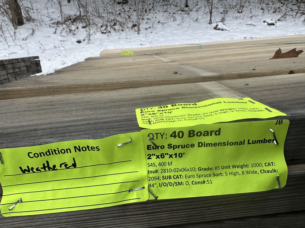 Euro Spruce Dimensional Lumber 2"x6"x10'. S4S, 400 Board Foot, Grade: #3 *Weathered, Please See Photos*. Weight: 1000. Sold by: Board. Sold as: Price X Quantity. Inventory #: 2810-02x06x10