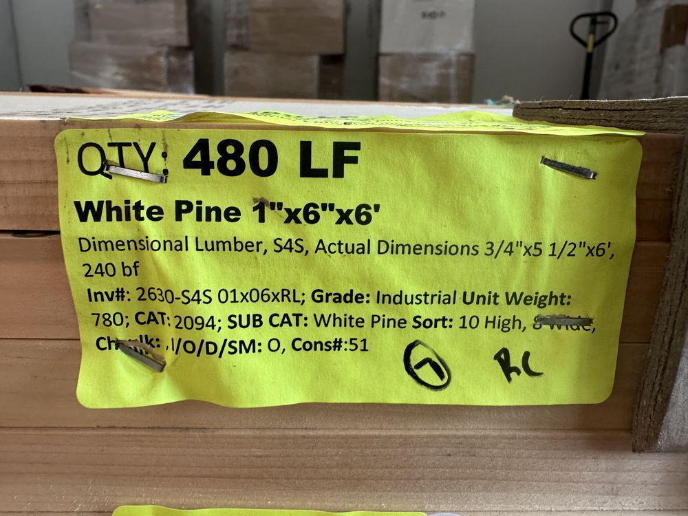 White Pine Dimensional Lumber 1"x6"x6'. S4S, Actual Dimensions 3/4"x5 1/2"x6', 240 board foot, Grade: Industrial. Weight: 780. Sold by: Linear Foot. Sold as: Price X Quantity. Inventory #: 2630-S4S 01x06xRL