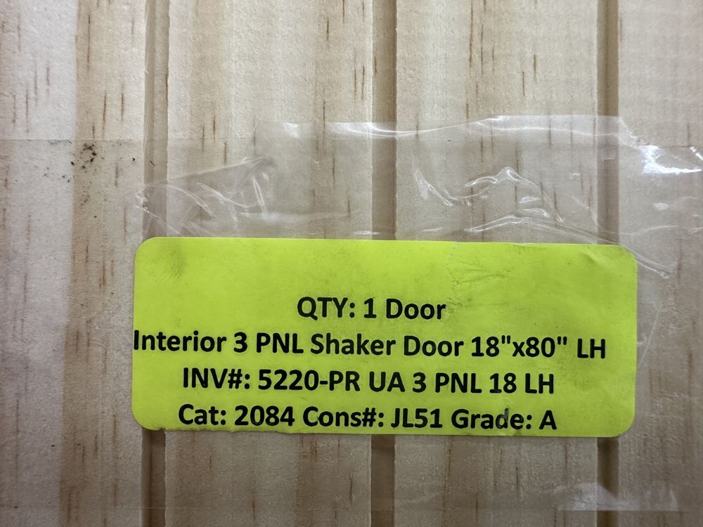 Interior Primed 3 PNL Shaker Door 18"x80" LH (Unassembled). 3 PNL 18" LH Grade: A. Weight: x. Sold by: Door. Sold as: Price X Quantity. Inventory #: 5220-PR UA 3 PNL 18 LH