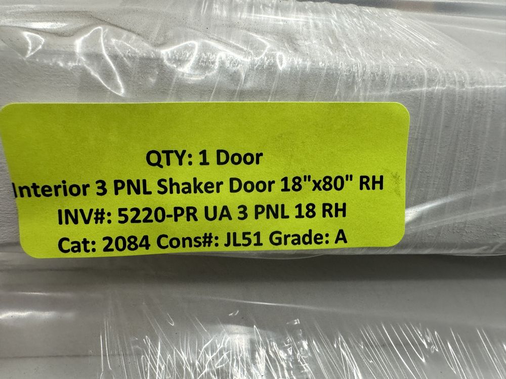Interior Primed 3 PNL Shaker Door 18"x80" RH (Unassembled). 3 PNL 18" RH Grade: A. Weight: x. Sold by: Door. Sold as: Price X Quantity. Inventory #: 5220-PR UA 3 PNL 18 RH