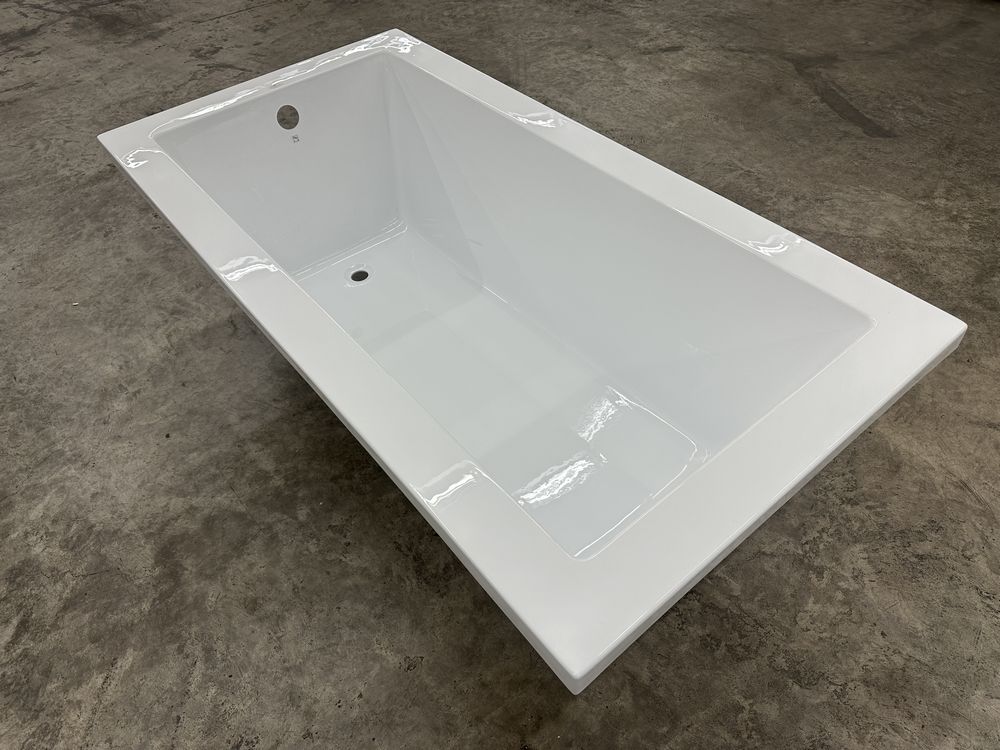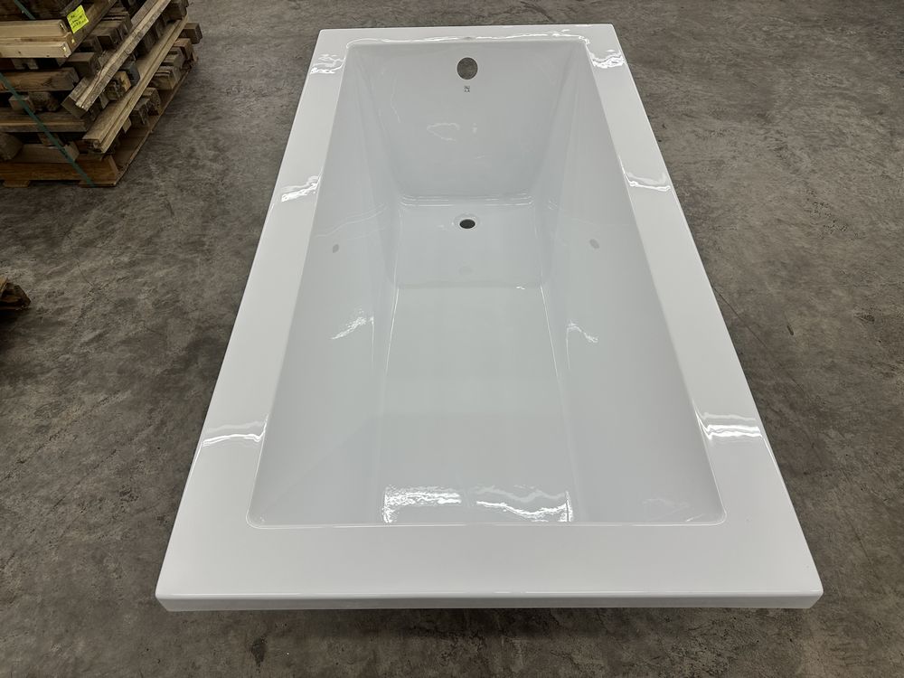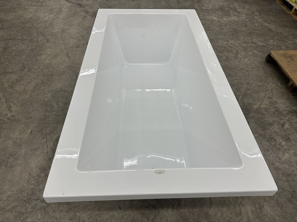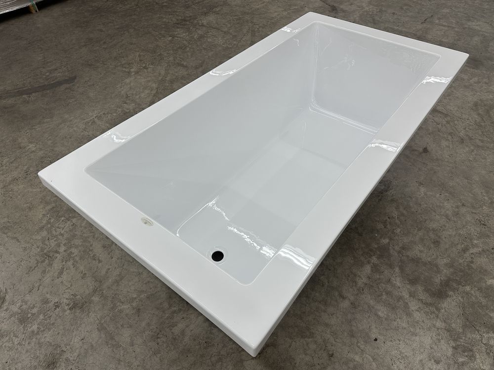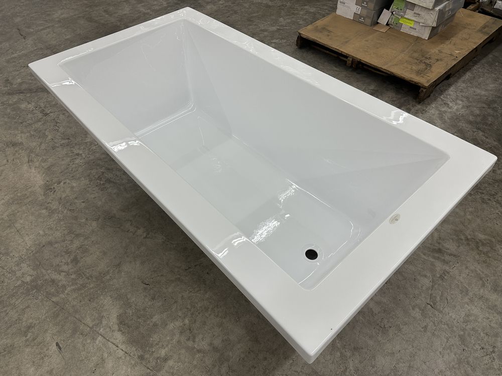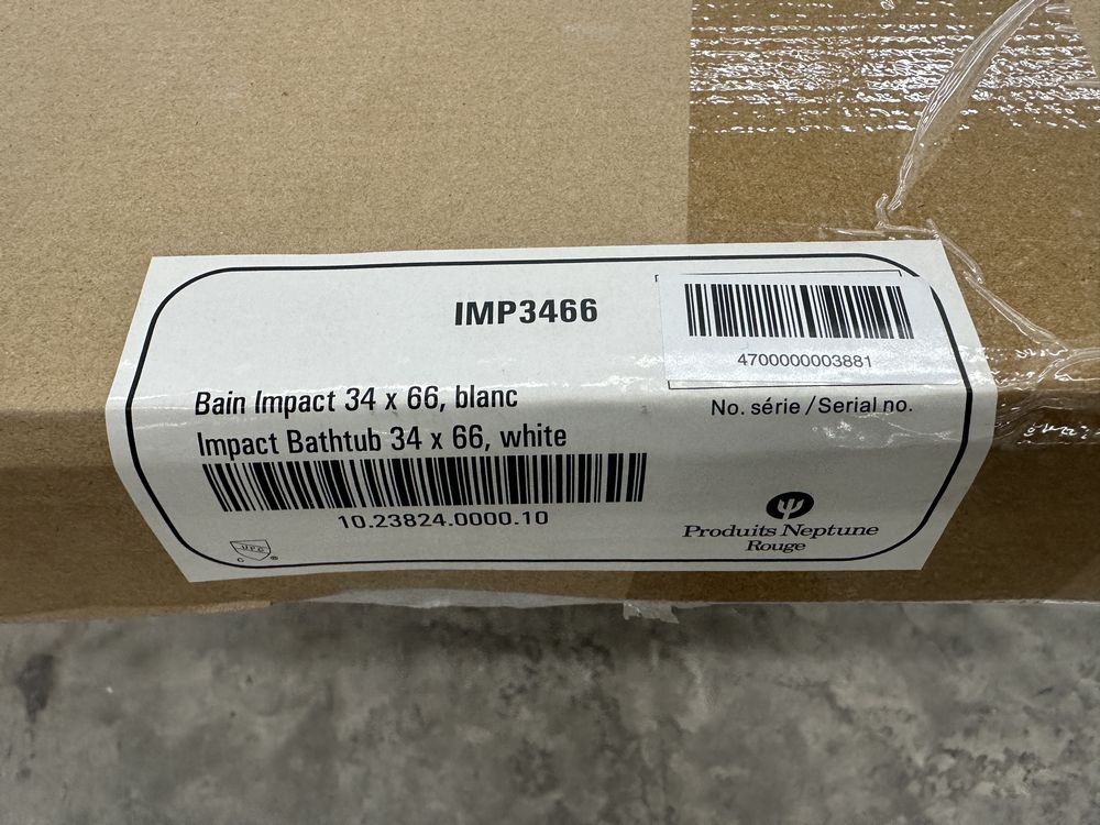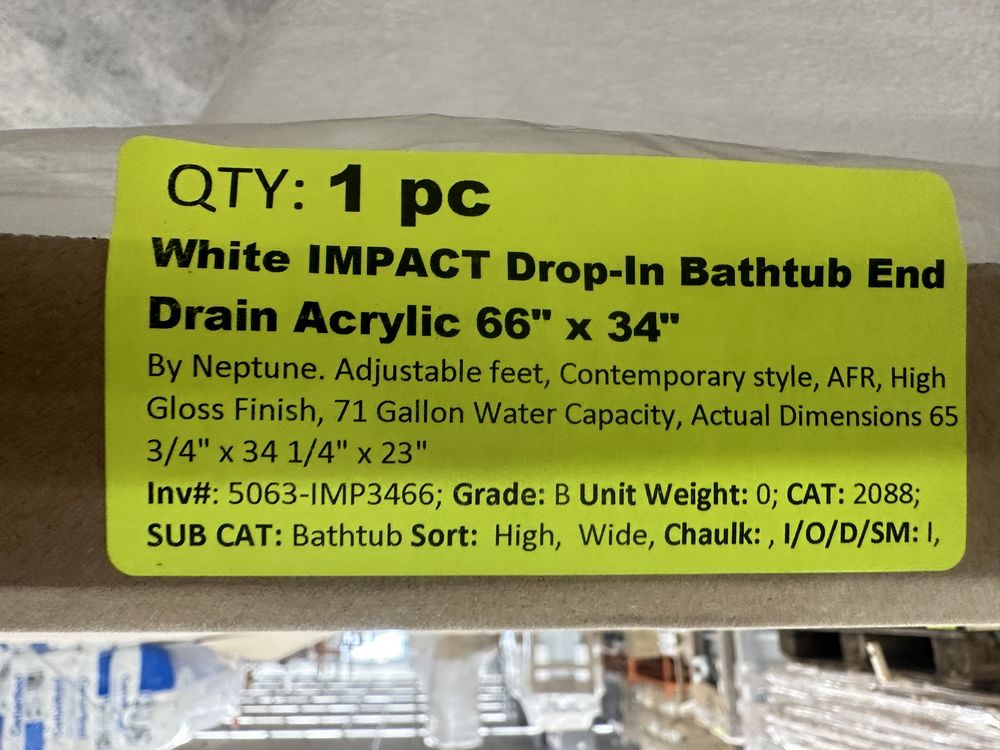 White IMPACT Drop-In Bathtub End Drain Acrylic 66"x34". By Neptune, Adjustable Feet, Contemporary Style, AFR, High Gloss Finish, 71 Gallon Water Capacity, Actual Dimensions 65 3/4"x34 1/4"x 23", Grade: B. Weight: x. Sold by: Piece. Sold as: Price X Quantity. Inventory #: 5063-IMP3466