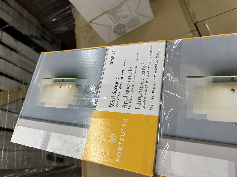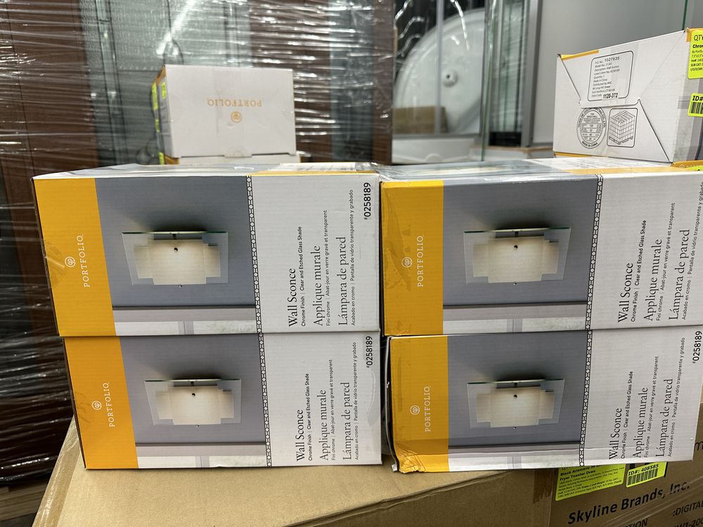 4 Pack Chrome Wall Sconces. By Portfolio, Chrome Finish, Clear And Etched Glass Shade 7.5"x3.5"10.63", Uses 1 Candelabra-Base Bulb, Grade: A. Weight: 12. Sold by: Piece. Sold as: Price X Quantity. Inventory #: 2461-0258189