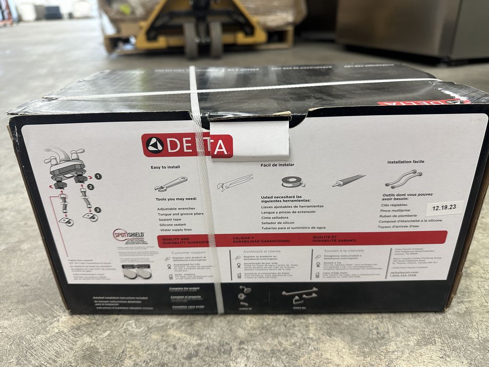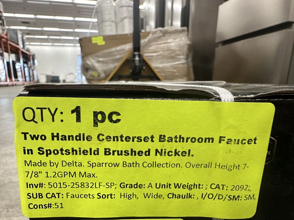 Two Handle Centerset Bathroom Faucet in Spotshield Brushed Nickel. Made By Delta. Sparrow Collection. Overall Height 7-7/8" 1.2GPM Max Grade: A. Weight: x. Sold by: Piece. Sold as: Price X Quantity. Inventory #: 5015-25832LF-SP