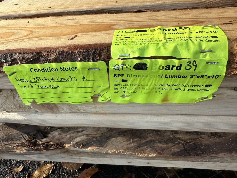 SPF Dimensional Lumber 2"x6"x10'. S4S, 390 Board Foot, Grade: PMO *Heavy Splits/Cracks, Fork Damage, SEE PHOTOS*. Weight: 920. Sold by: Board. Sold as: Price X Quantity. Inventory #: 2660-PMO 02x06x10