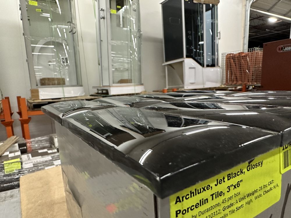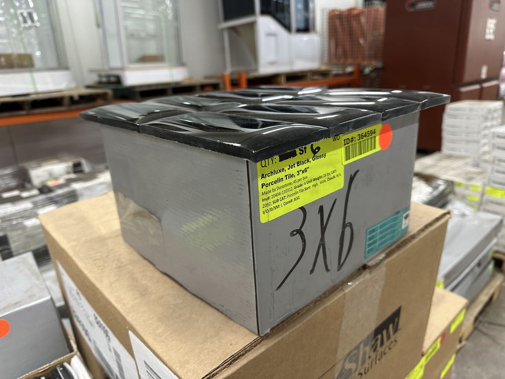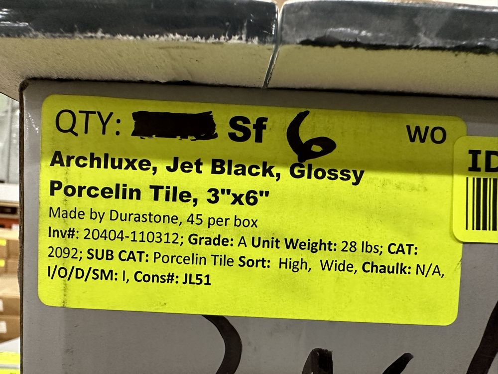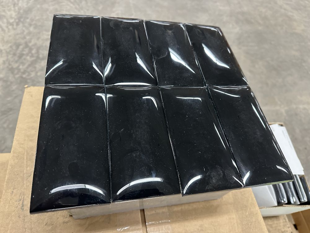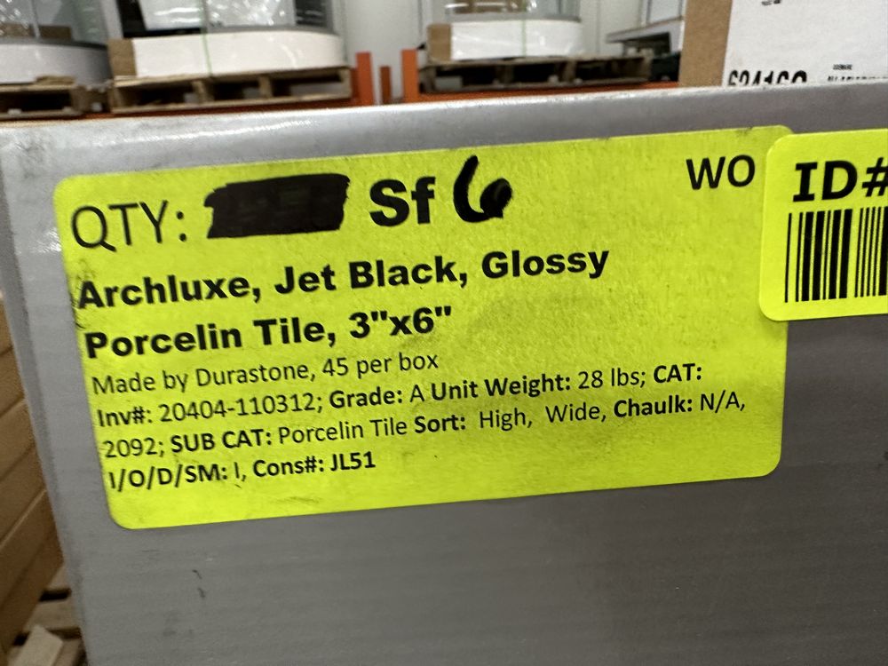 Archluxe, Jet Black, Glossy Porcelain Tile 3"x6". Made by Durastone, Beveled, 45 per box, 1 box, Grade: A. Weight: 28 lbs. Sold by: Square Foot. Sold as: Price X Quantity. Inventory #: 20404-110312