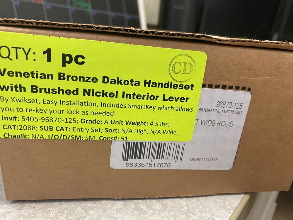 Venetian Bronze Dakota Handleset With Brushed Nickel Interior Lever. By Kwikset, Easy Installation, Includes SmartKey Which allows you to re-key your lock as needed, Grade: A. Weight: 4.5. Sold by: Piece. Sold as: Price X Quantity. Inventory #: 5405-96870-125