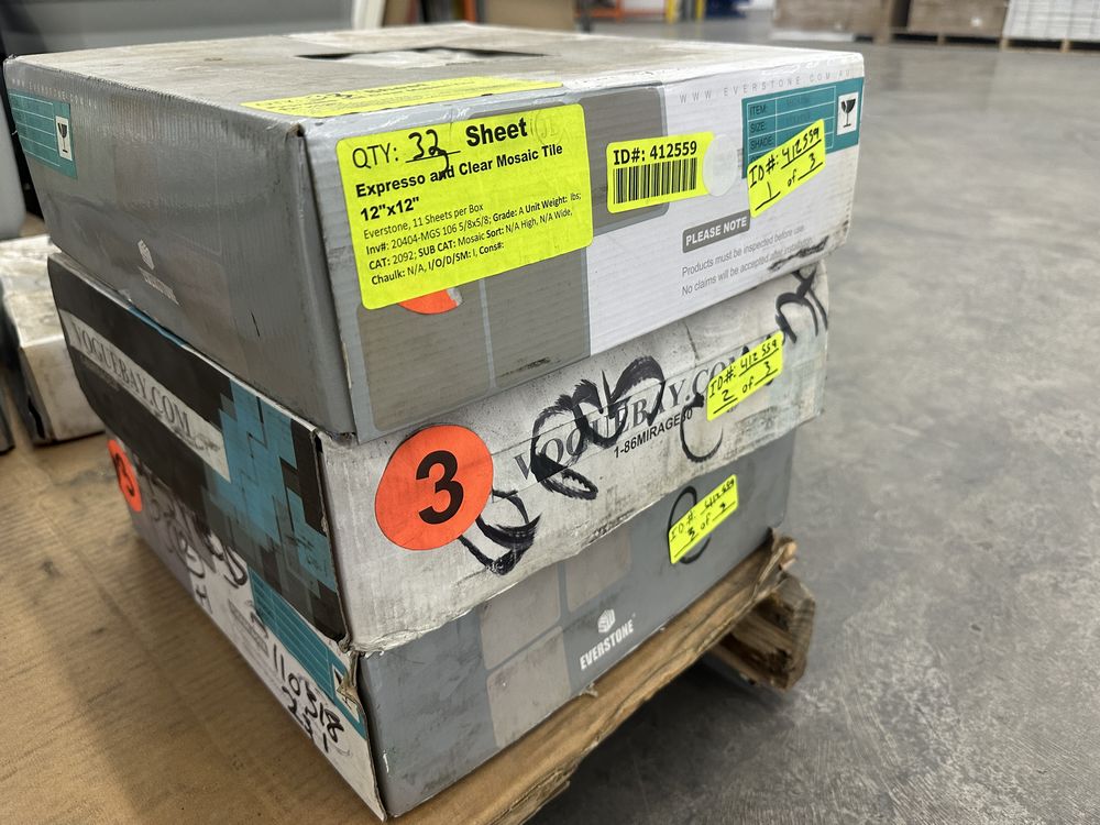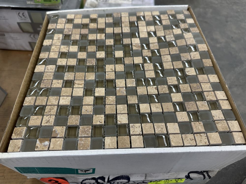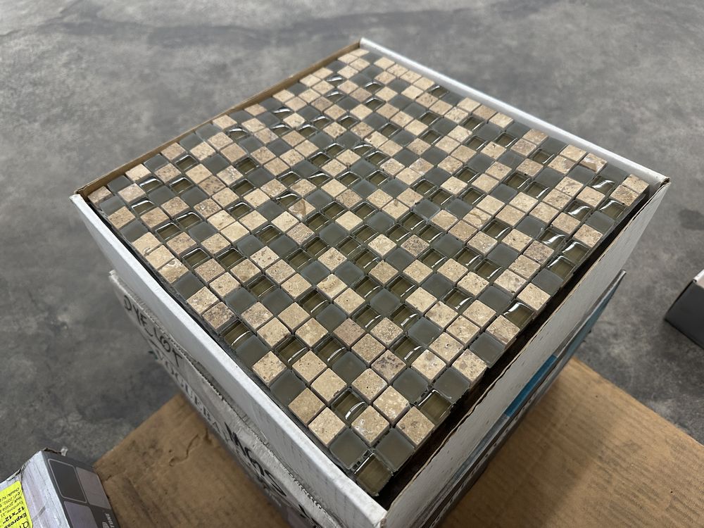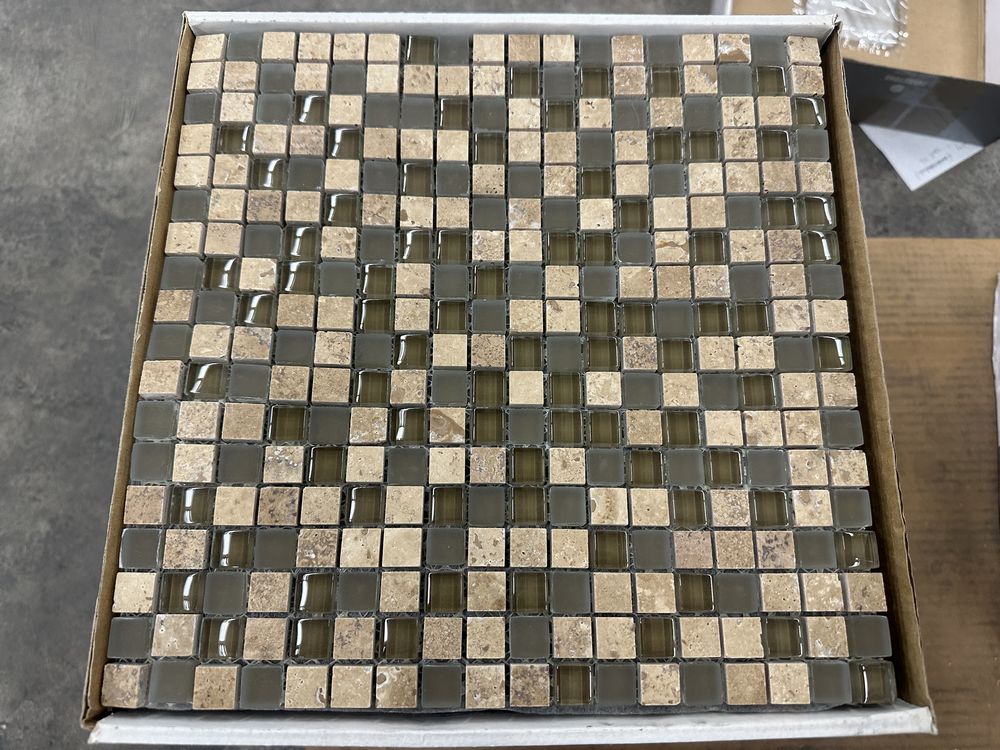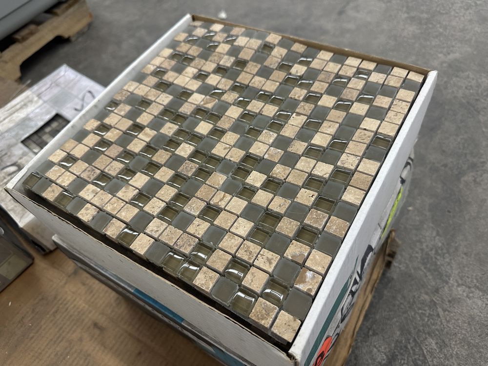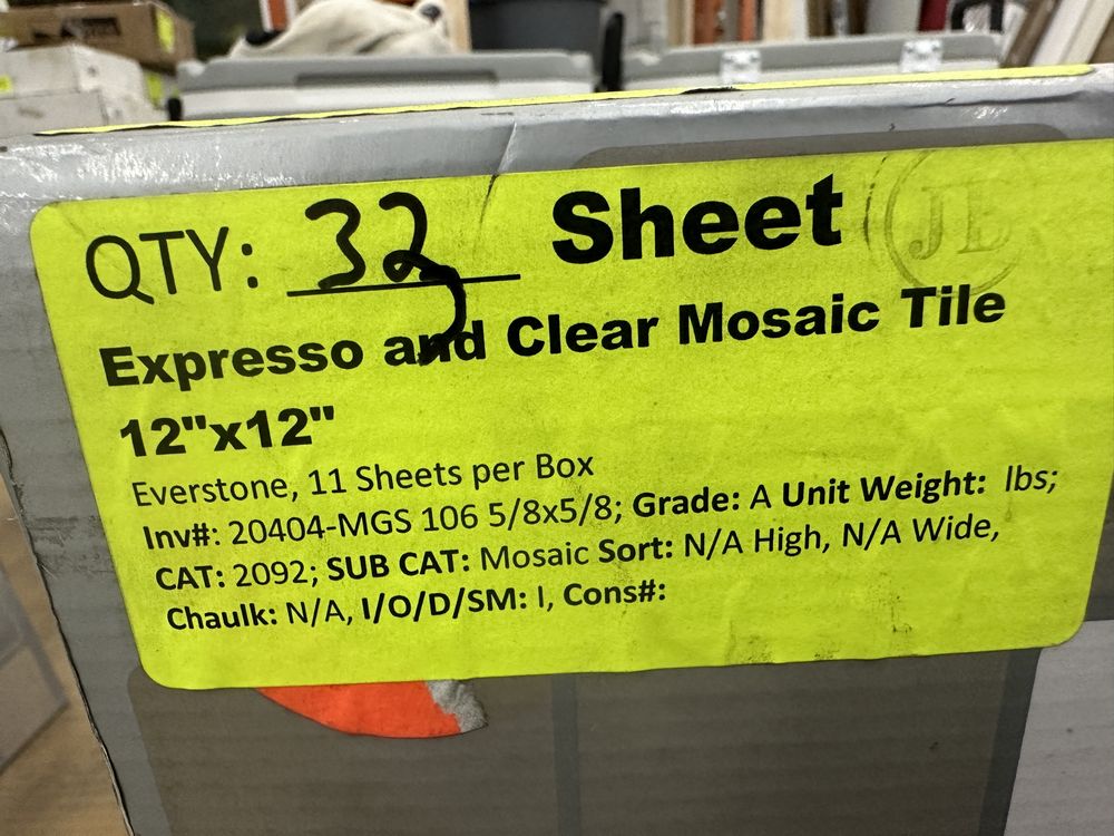 Espresso and Clear Mosaic Tile 12"x12". Everstone, 1 box with 12 sheets, 1 box with 10 sheets, 1 box with 11 sheets, 3 boxes total, Grade: A. Weight: X. Sold by: Sheet. Sold as: Price X Quantity. Inventory #: 20404-MGS 106 5/8x5/8