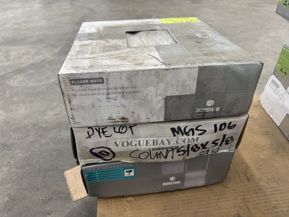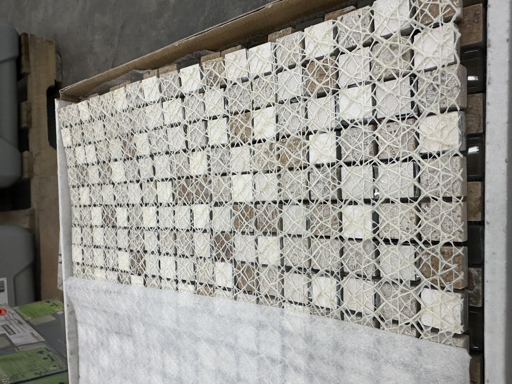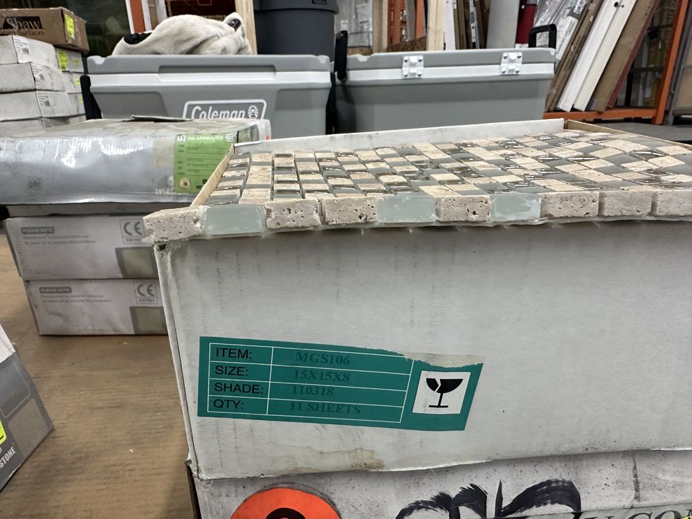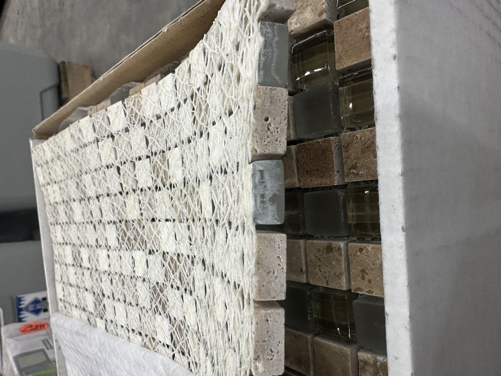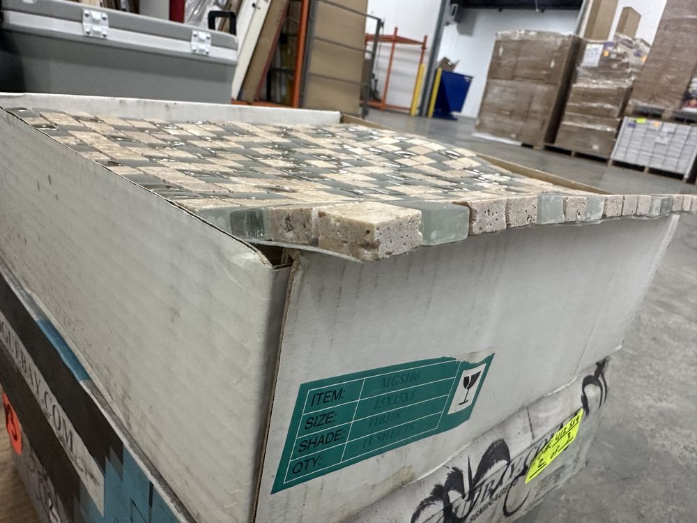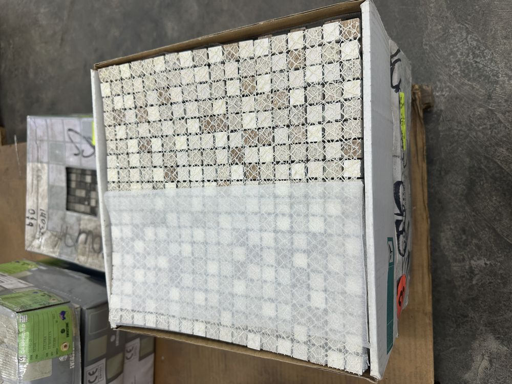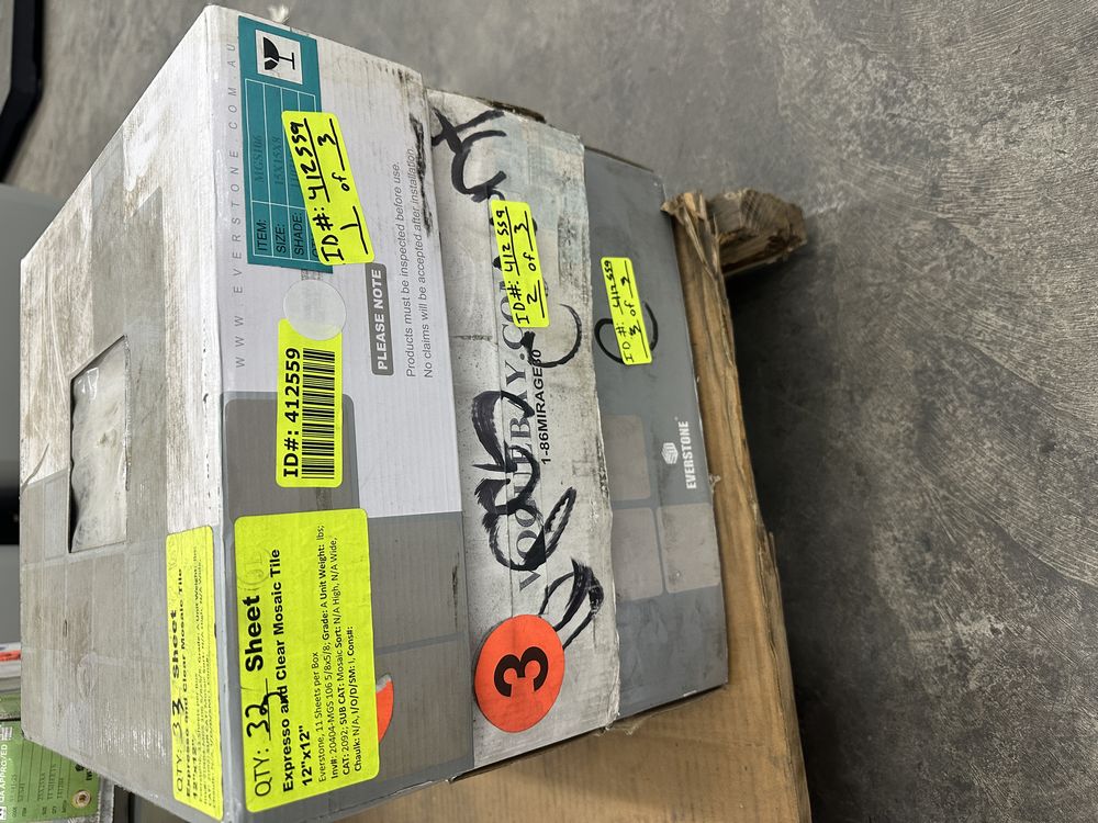Espresso and Clear Mosaic Tile 12"x12". Everstone, 1 box with 12 sheets, 1 box with 10 sheets, 1 box with 11 sheets, 3 boxes total, Grade: A. Weight: X. Sold by: Sheet. Sold as: Price X Quantity. Inventory #: 20404-MGS 106 5/8x5/8