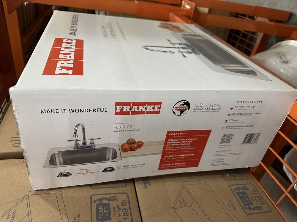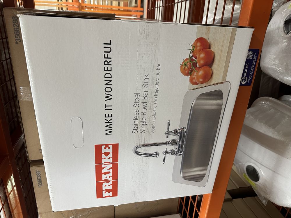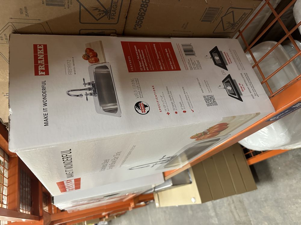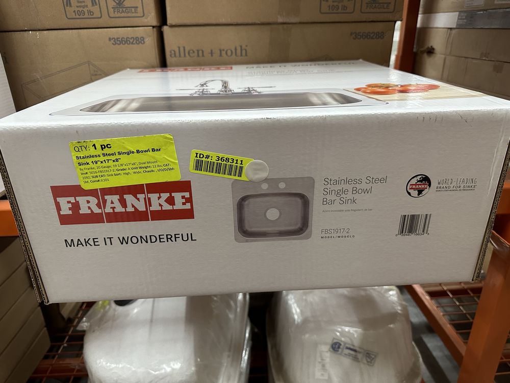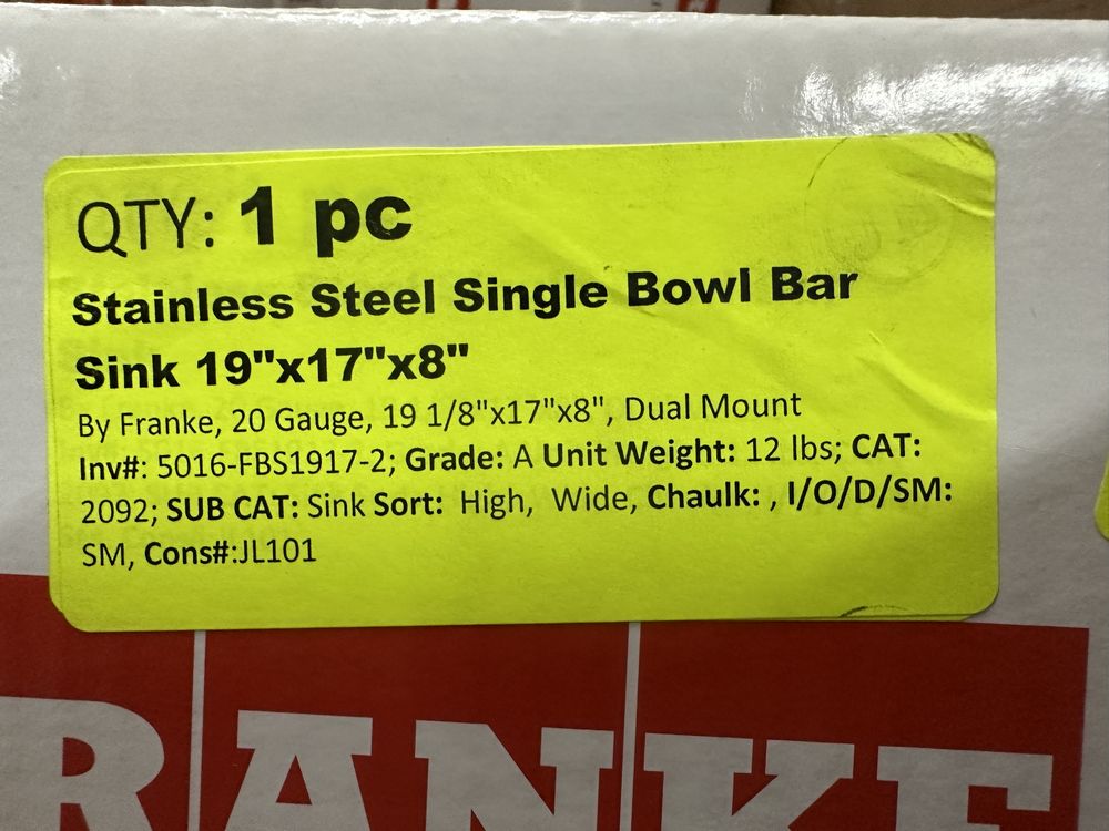 Stainless Steel Single Bowl Bar Sink 19"x17"x8". By Franke, 20 Guage, 19 1/8"x17"x8", Dual Mount, Grade: A. . Weight: 12. Sold by: Piece. Sold as: Price X Quantity. Inventory #: 5016-FBS1917-2