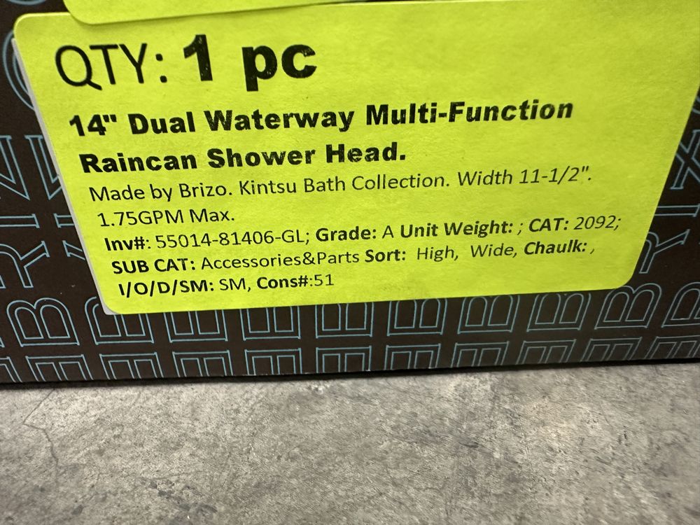 14" Dual Waterway Muilti-Function Raincan Shower Head. Made by Brizo. Kintsu Bath Collection. Width 11-1/2" 1.75GPM Max. Grade : A. Weight: x. Sold by: Piece. Sold as: Price X Quantity. Inventory #: 55014-81406-GL