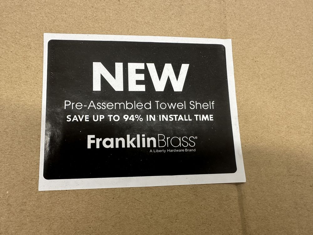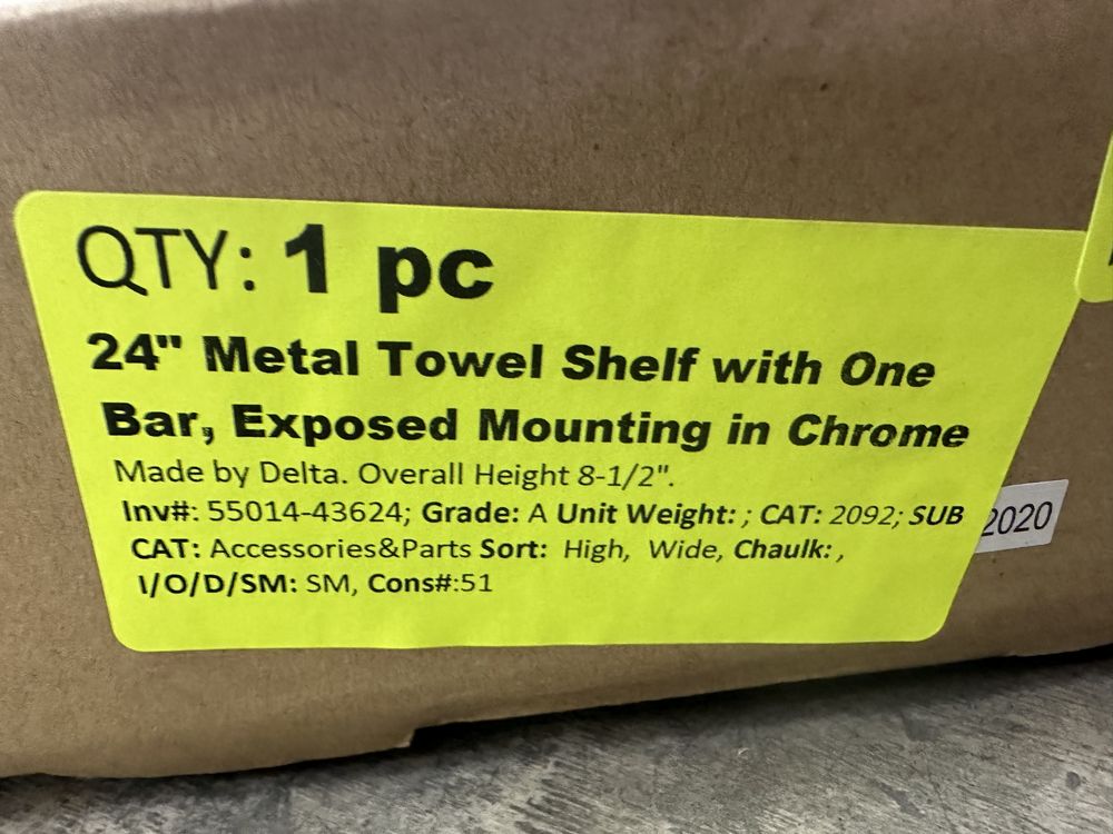 24" Metal Towel Shelf with One Bar, Exposed Mounting in Chrome. Made by Delta. Overall Height 8-1/2" Grade: A. Weight: x. Sold by: Piece. Sold as: Price X Quantity. Inventory #: 55014-43624