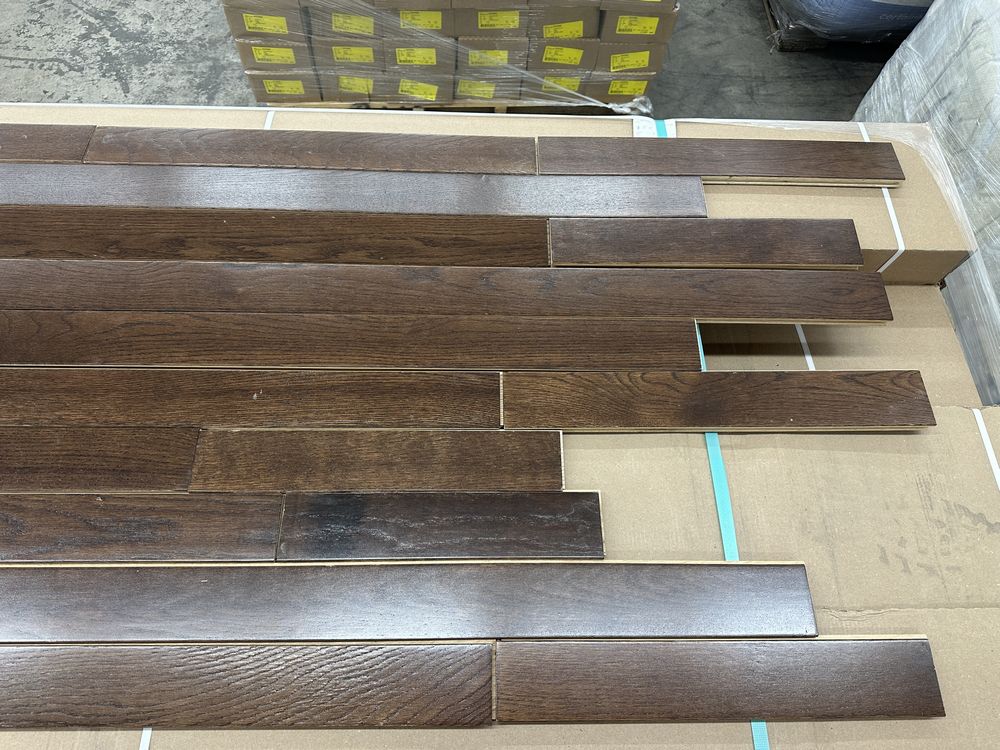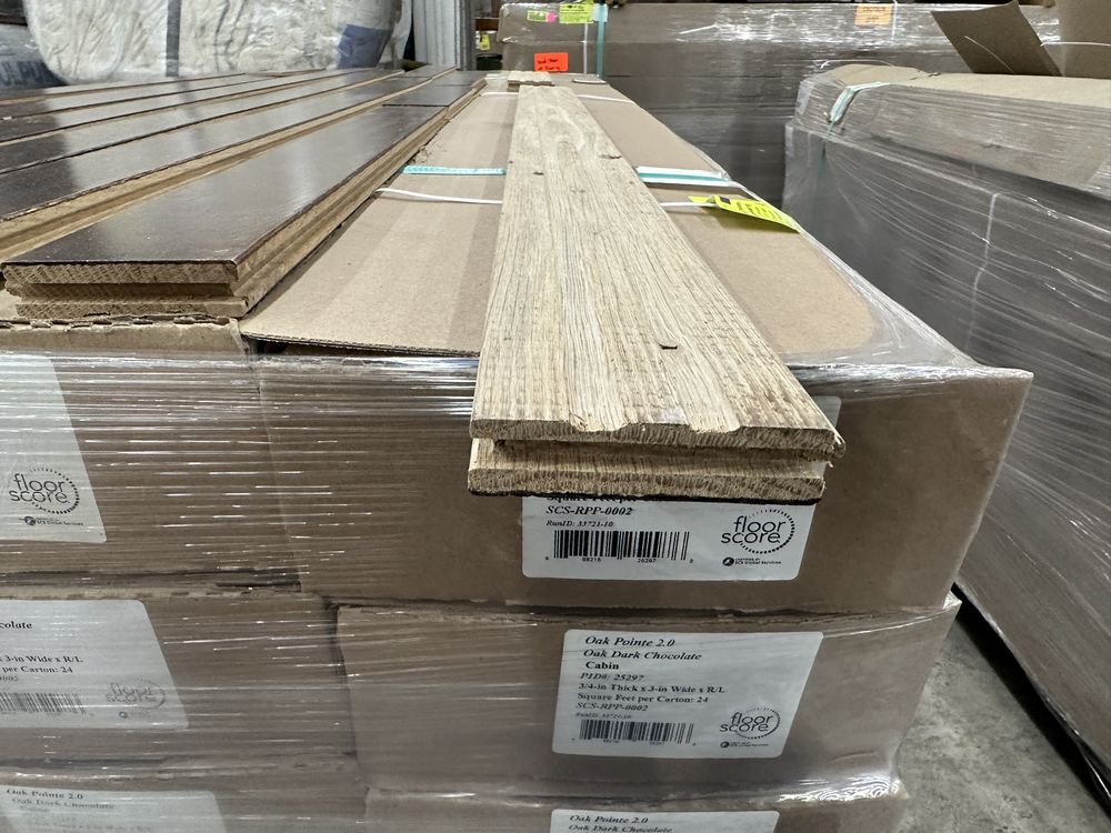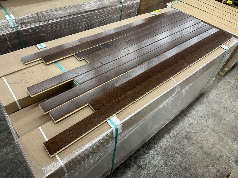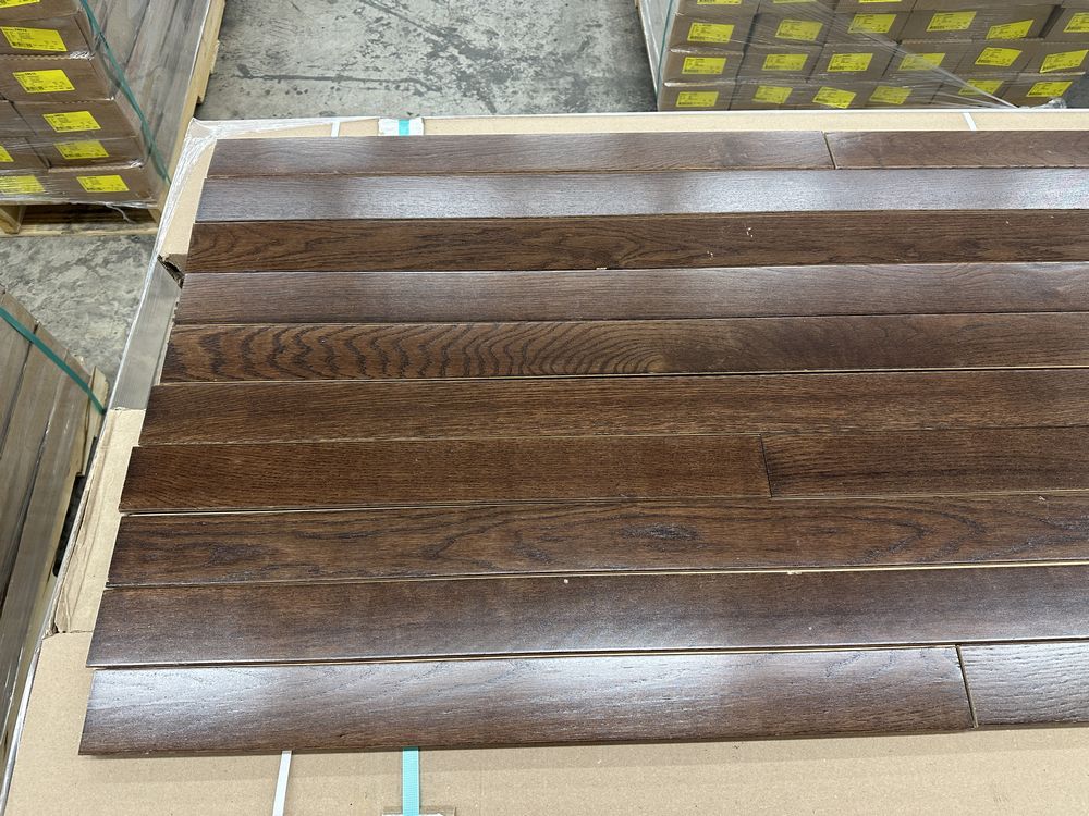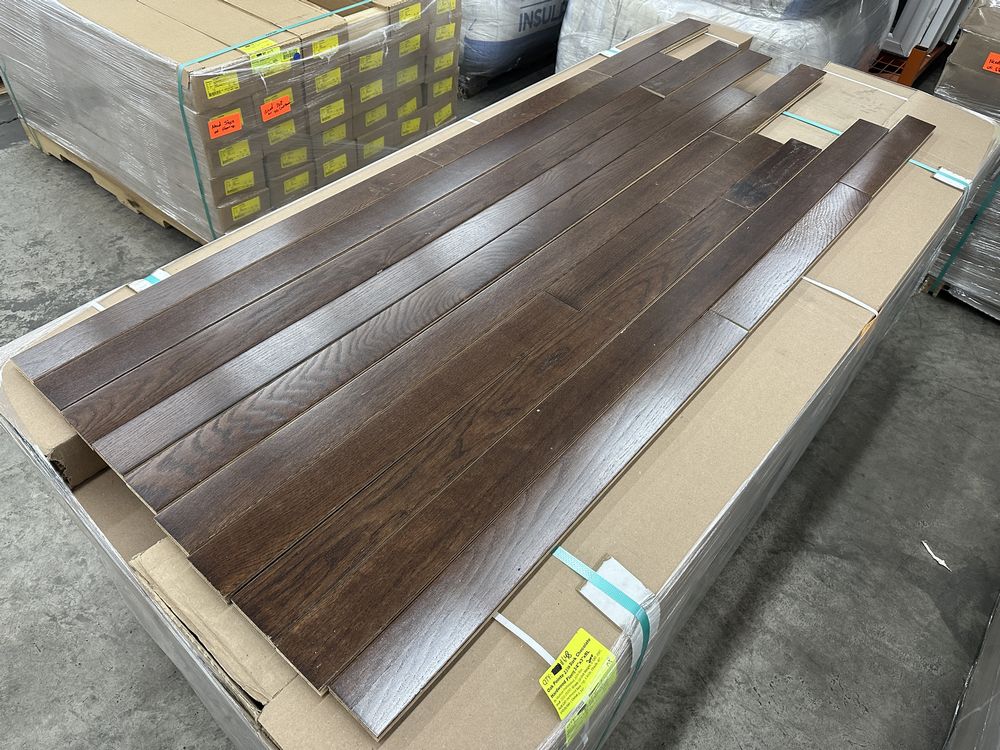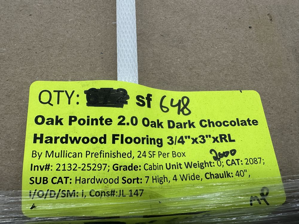 Oak Pointe 2.0 Oak Dark Chocolate Hardwood Flooring 3/4"x3"xRL. By Mullican Prefinished, 24 Square Foot Per Box, Grade: Cabin/Utility/Tavern Grade: This flooring product will have varying wood characteristics and colors to include streaks, deeper knots and burls, small splits, wormholes, and even marks during the milling process such as machine burns. It may also have a large variance in color and grain patterns. The boards are typically 10” to 30” with an average board length of 16”. It is usually packaged in mini bundles of 18-20 sf per bundle. It is ok for 5” wide to be heavier in shorter pieces. Cabin grade is a stable, installable product but please account up to 10%-20% waste. Weight: 2000. Sold by: Square Foot. Sold as: Price X Quantity. Inventory #: 2132-25297