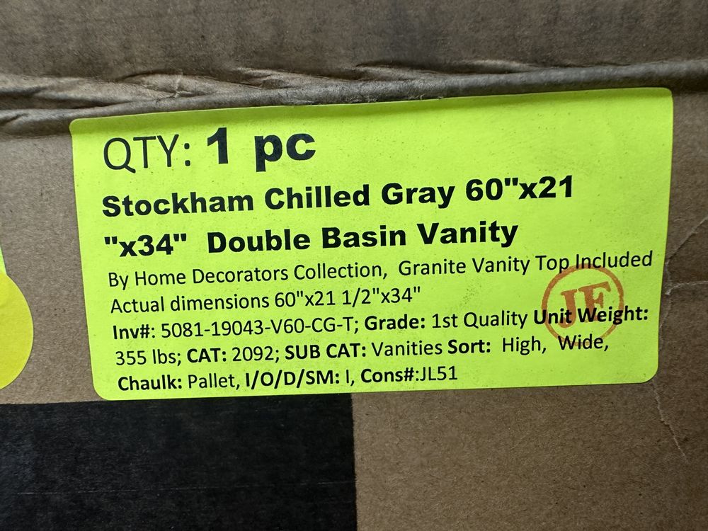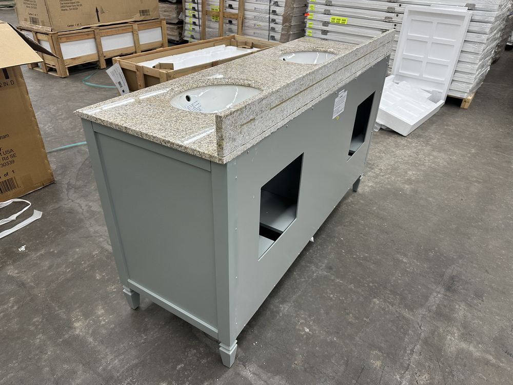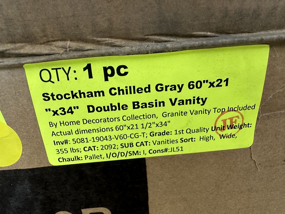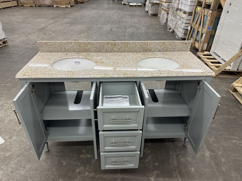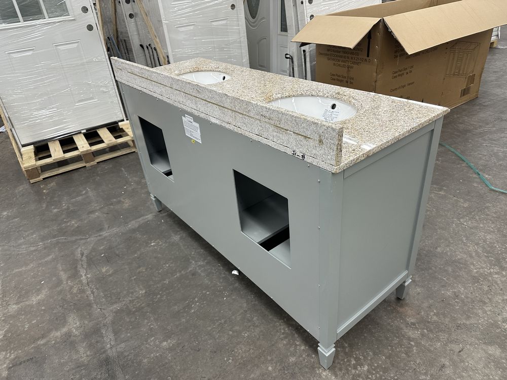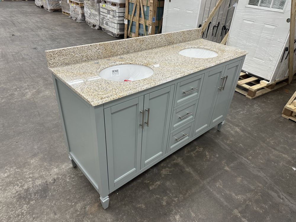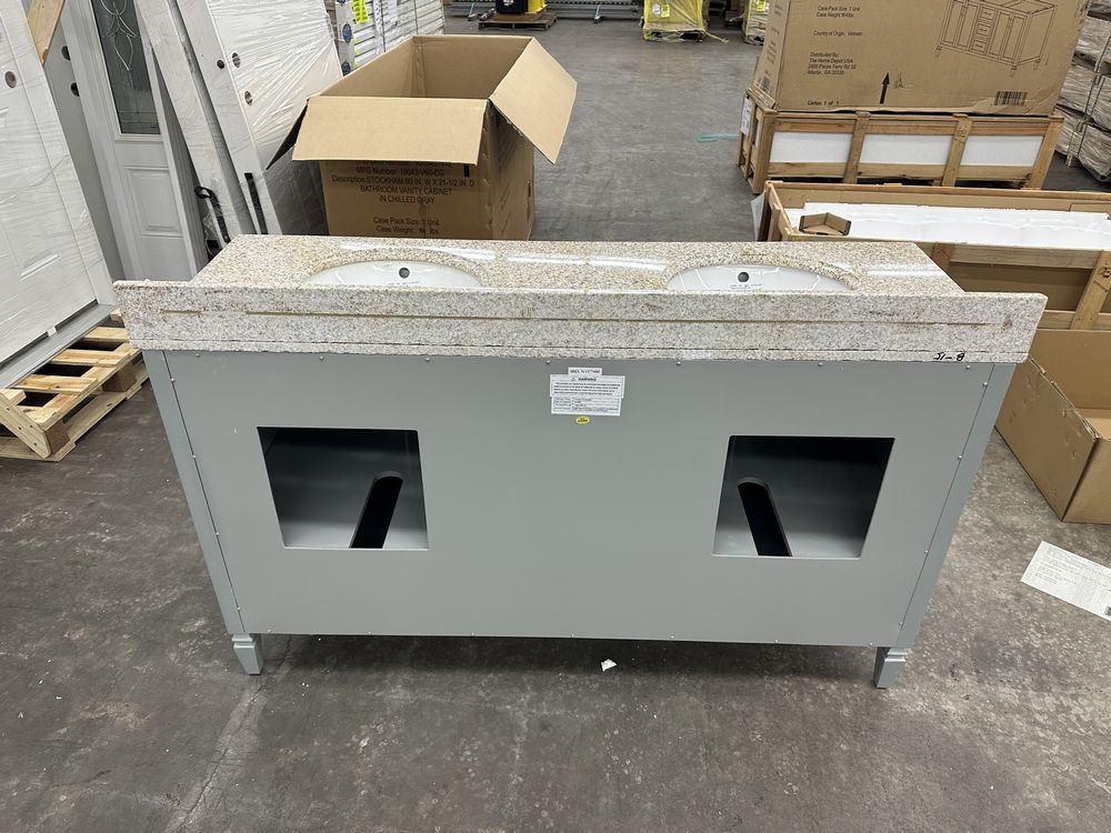 Stockham Chilled Gray 60"x21"x34" Double Basin Vanity. By Home Decorators Collection, Granite Vanity Top Included, Actual Dimensions 60"x21 1/2"x34" Grade: 1st Quality. Weight: 355. Sold by: Piece. Sold as: Price X Quantity. Inventory #: 5081-19043-V60-CG-T