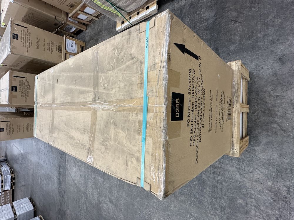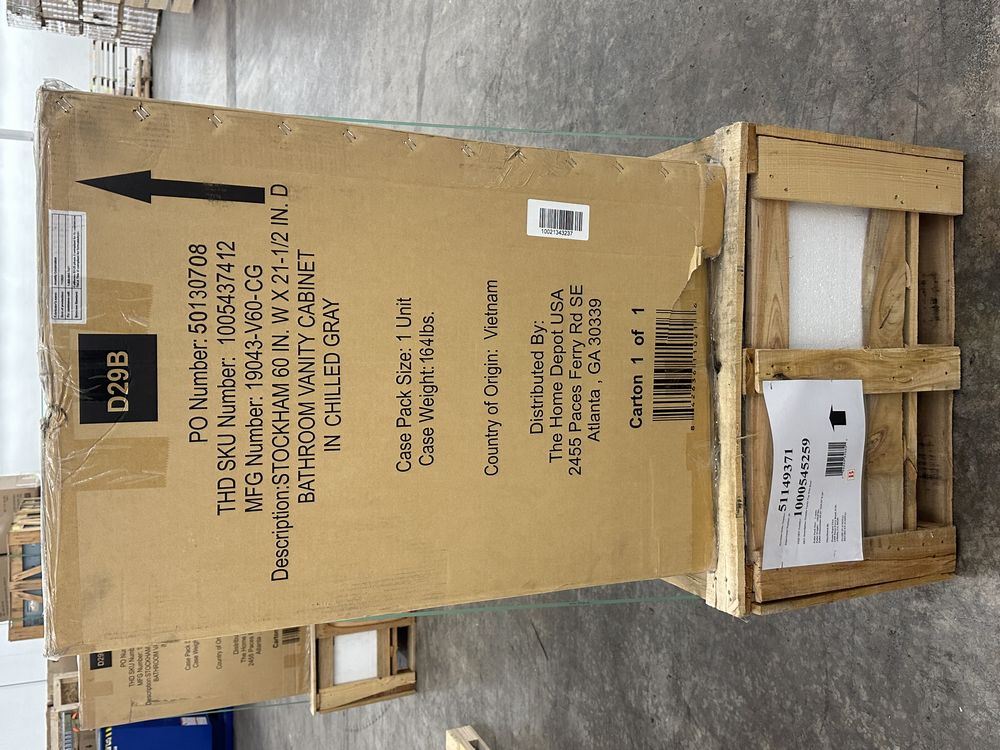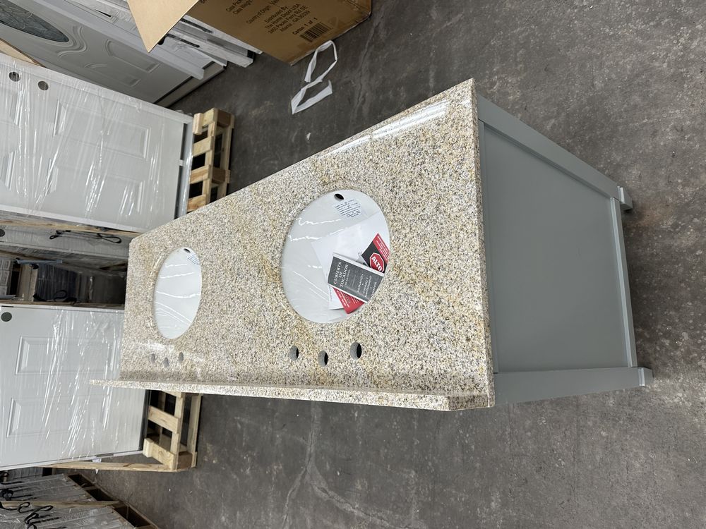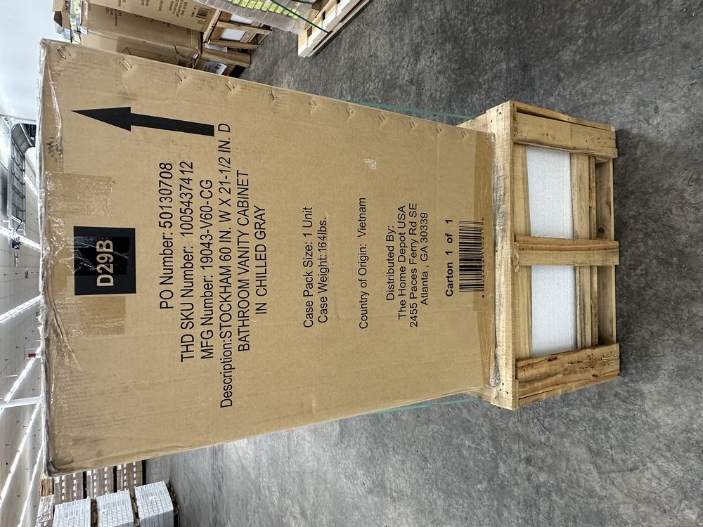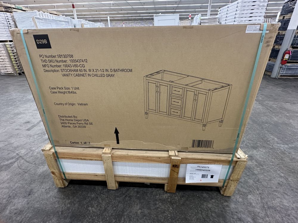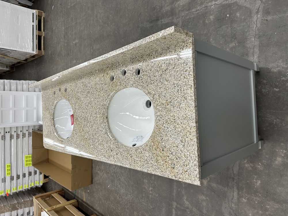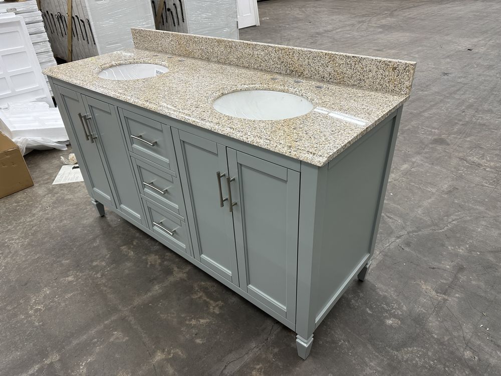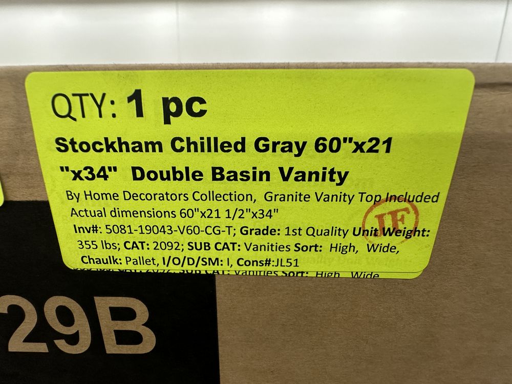 Stockham Chilled Gray 60"x21"x34" Double Basin Vanity. By Home Decorators Collection, Granite Vanity Top Included, Actual Dimensions 60"x21 1/2"x34" Grade: 1st Quality. Weight: 355. Sold by: Piece. Sold as: Price X Quantity. Inventory #: 5081-19043-V60-CG-T