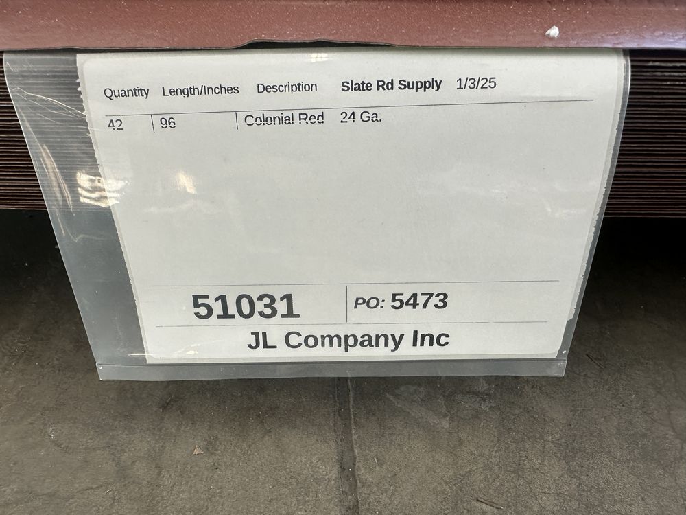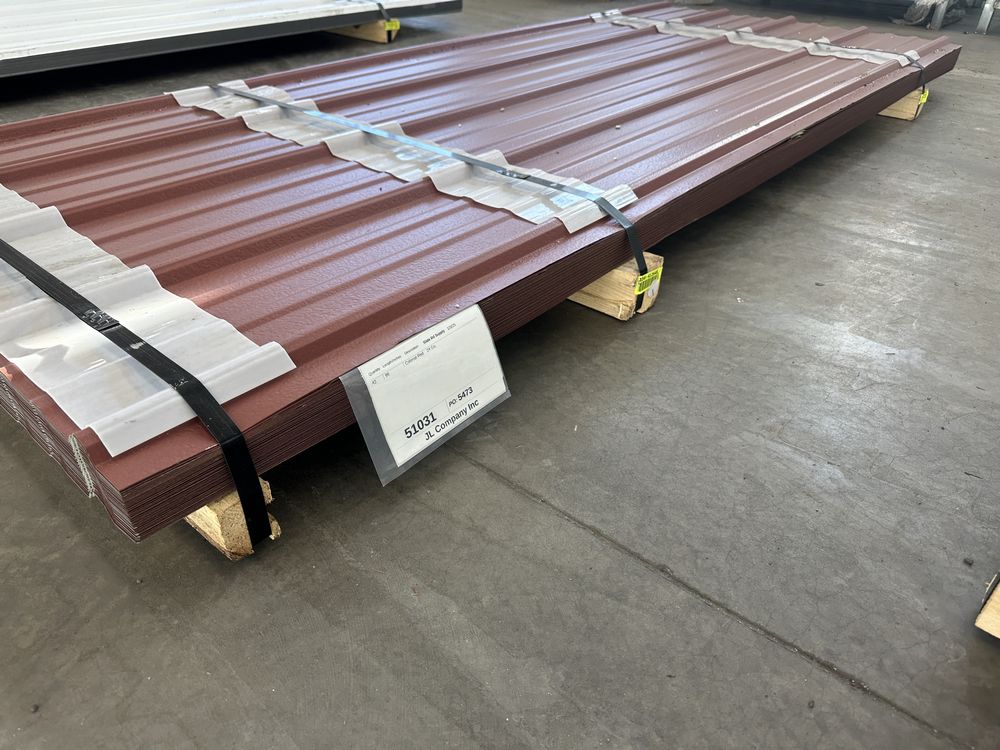 Colonial Red Corrugated Metal Panel 3'x8'. 24 Gauge, 42 Pieces, Grade: B. Metal can be labeled as "B Grade" for many reasons. Some may include possible paint imperfections such as; off colors, light or heavy coating, dirt in paint, paint splash or blisters. They may contain steel imperfections such as; creases, wrinkles, wavy edges, dents, or general handling damage. When bidding on Grade B metal panels please don't assume that any two lots are the same. If you want to buy more than one (1) lot and need the same color please call us at 607-865-6951 to have us inspect the lots before you purchase. Weight: 1058. Sold by: Linear Foot. Sold as: Price X Quantity. Inventory #: 2850-RD 3xRL