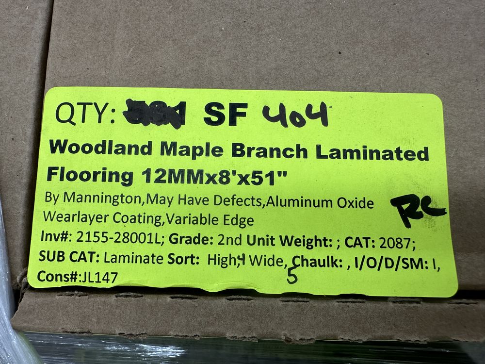 Woodland Maple Branch Laminate Flooring 12mmx8"x51". By Mannington, May Have Defects, Aluminum Oxide Wearlayer Coating, Variable Edge, 21.22 Square Feet per Box, Grade: 2nd. Weight: 870. Sold by: Square Foot. Sold as: Price X Quantity. Inventory #: 2155-28001L