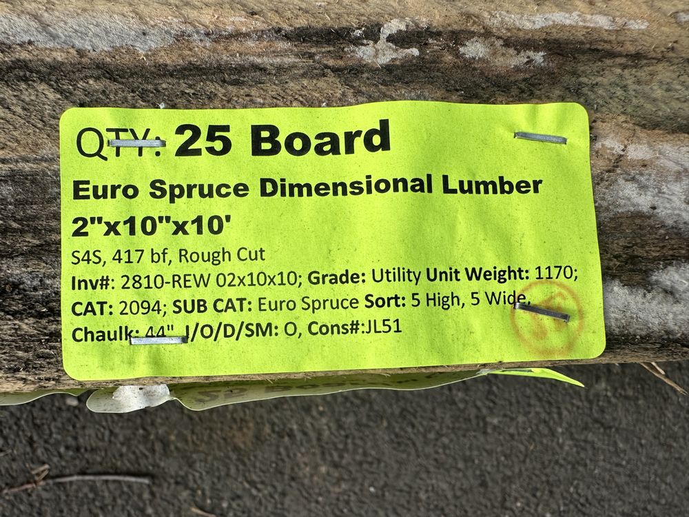 Euro Spruce Dimensional Lumber 2"x10"x10'. S4S, 417 Board Foot, Rough Cut, Grade: Utility *Aged, Mold, See Photos*. Weight: 1170. Sold by: Board. Sold as: Price X Quantity. Inventory #: 2810-REW 02x10x10
