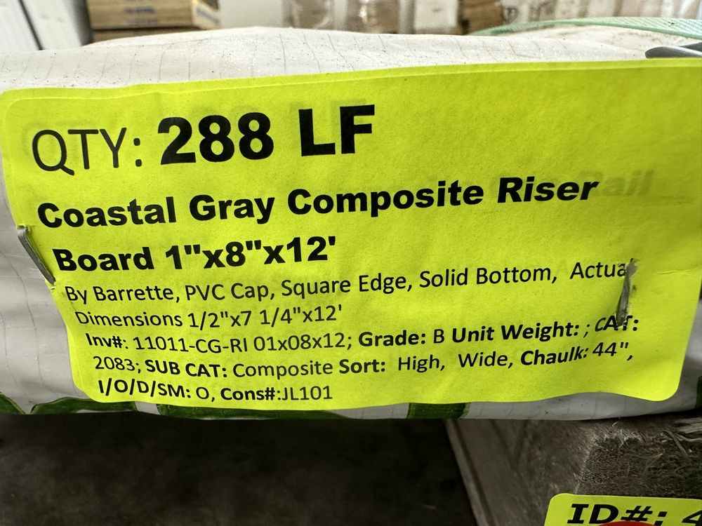 Coastal Gray Composite Riser Board 1"x8"x12'. By Barrette, PVC Cap, Square Edges, Solid Bottom Actual Dimensions 1/2"x7 1/4"x12', Grade: B. Weight: x. Sold by: Linear Foot. Sold as: Price X Quantity. Inventory #: 11011-CG-RI 01x08x12