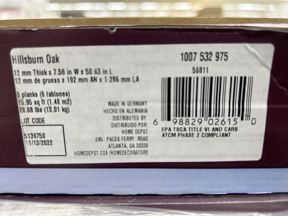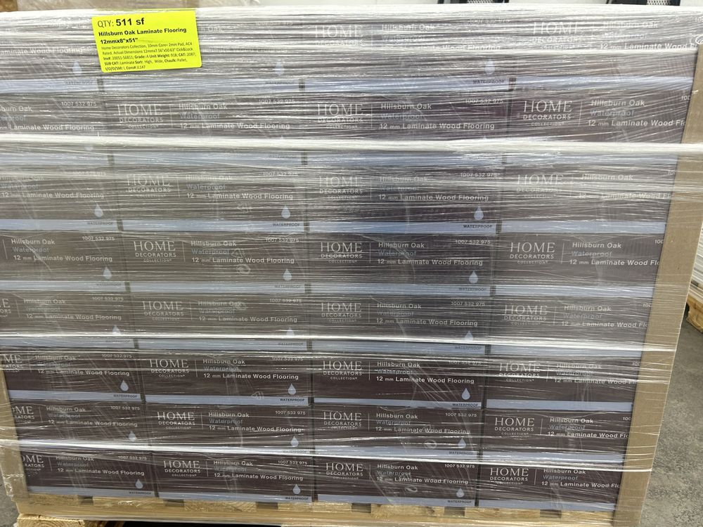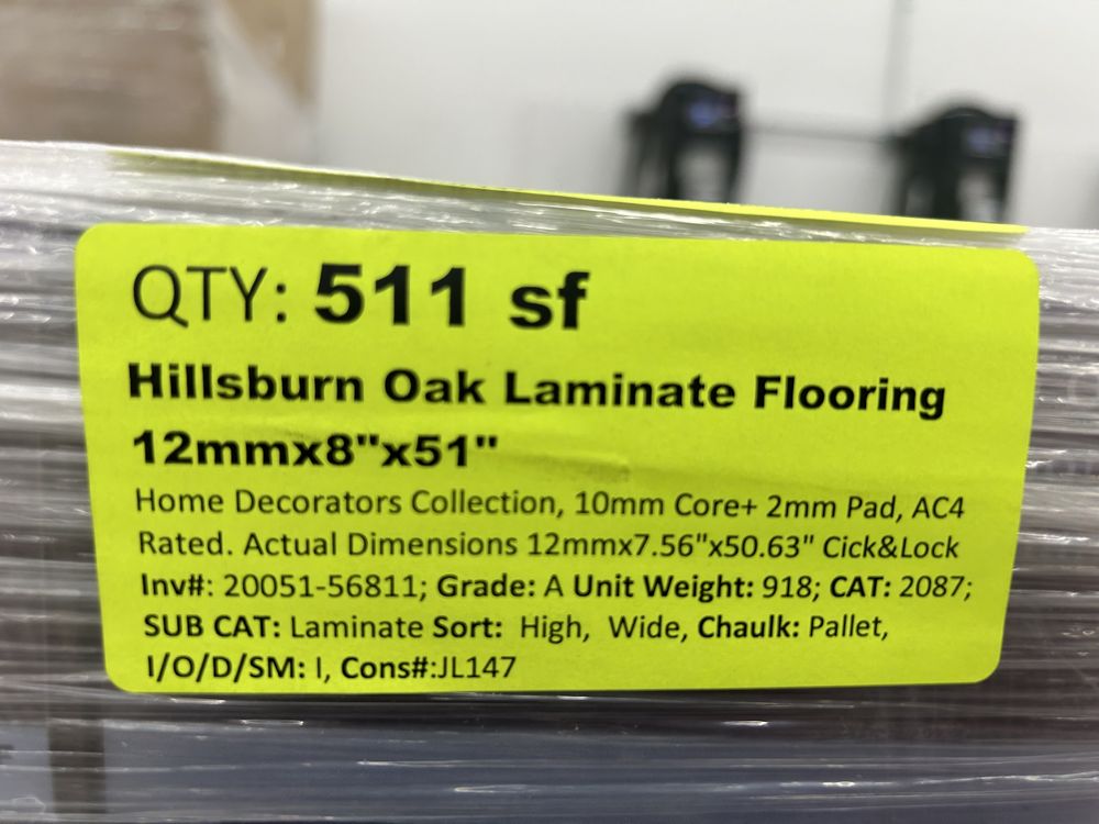 Hillsburn Oak Laminate Flooring 12MMx8"x51". Home Decorators Collection, 10mm Core+ 2mm Pad AC4 Rated, Actual Dimensions 12mmx7.56"x50.63" Click And Lock Grade: 1st Quality. Weight: 918. Sold by: Square Foot. Sold as: Price X Quantity. Inventory #: 20051-56811