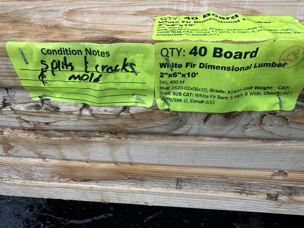 White Fir Dimensional 2"x6"x10'. S4S, 400 Board Foot, Grade: #2&btr *Heavy Splits/Cracks, Mold, SEE PHOTOS*. Weight: x. Sold by: Board. Sold as: Price X Quantity. Inventory #: 2620-02x06x10
