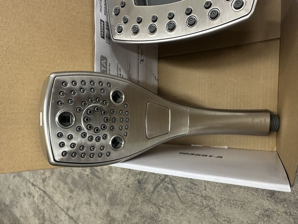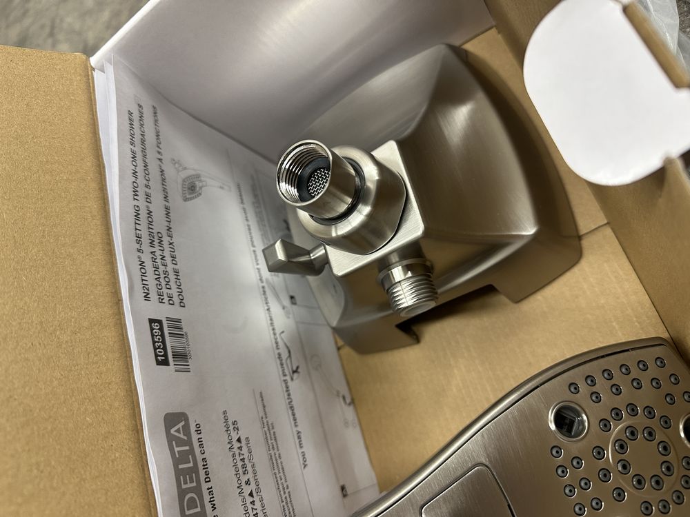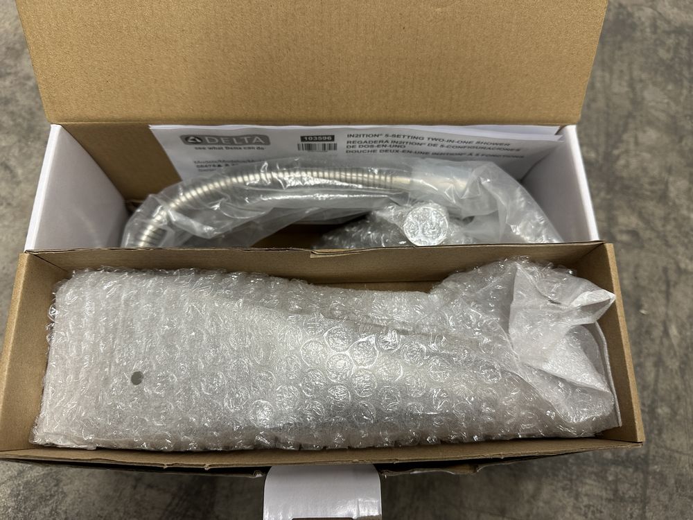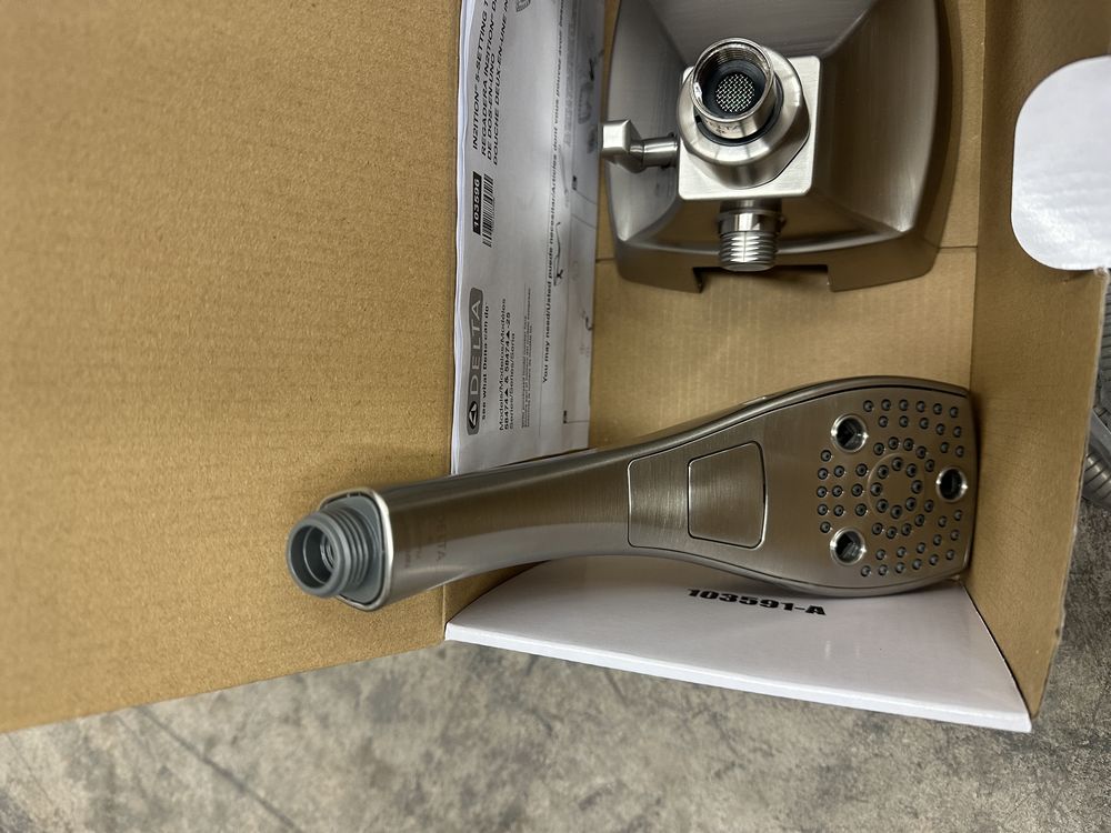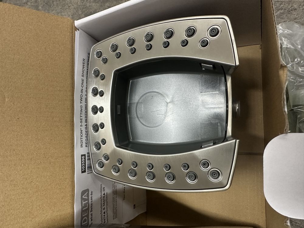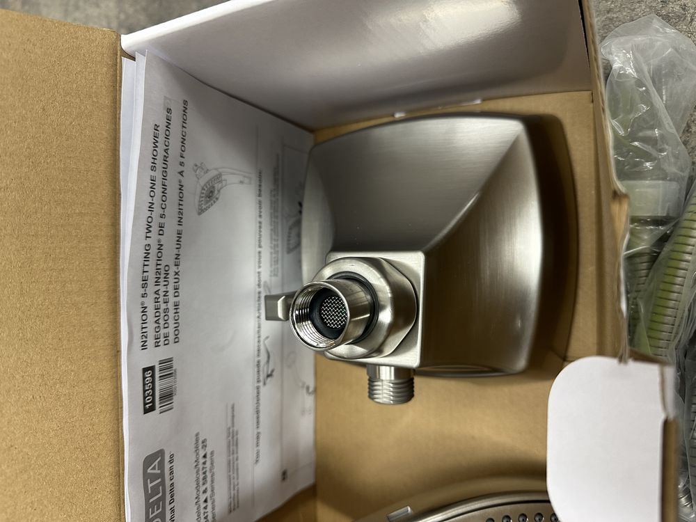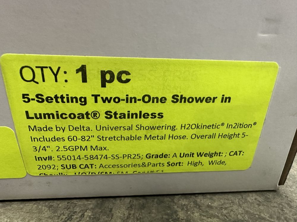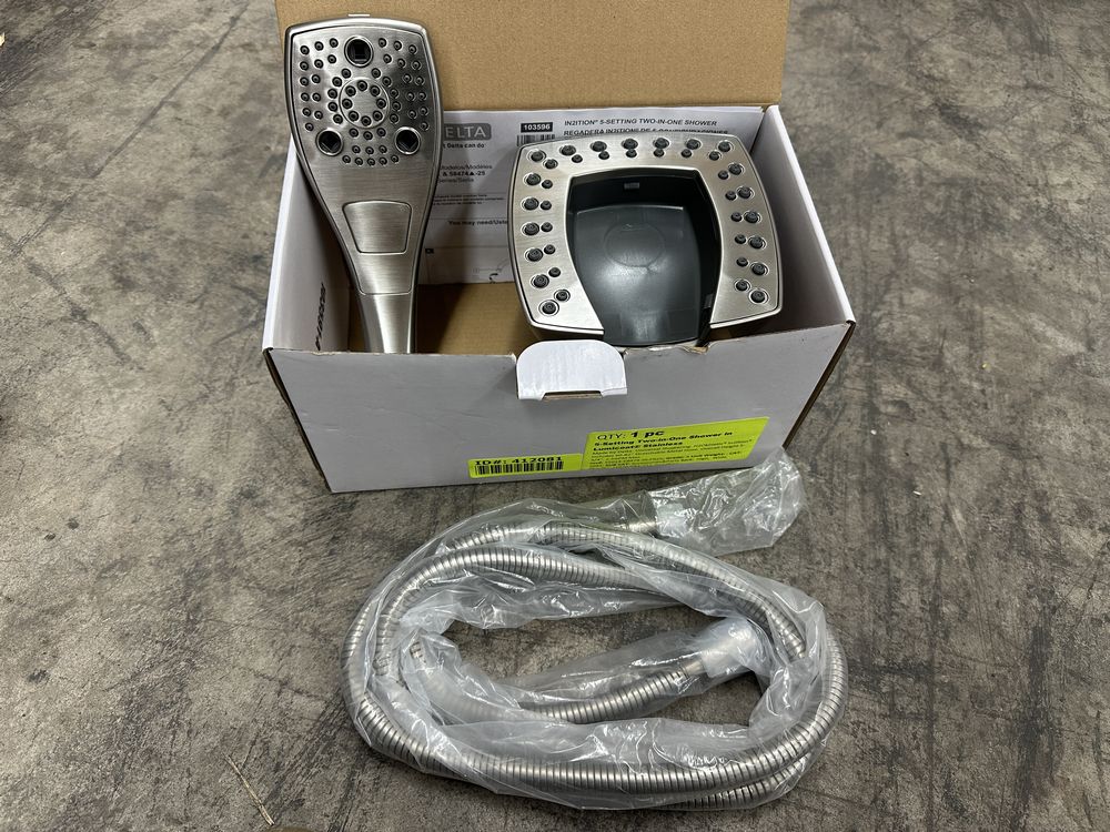 5-Setting Two-in-One Shower in Lumicoat Stainless. Made by Delta. Universal Showering. H20Kinetic In2ition Includes 60-82" Streachable Metal Hose. Overall height 5-3/4" 2.5GPM Max. Grade A. Weight: x. Sold by: Piece. Sold as: Price X Quantity. Inventory #: 55014-58474-SS-PR25