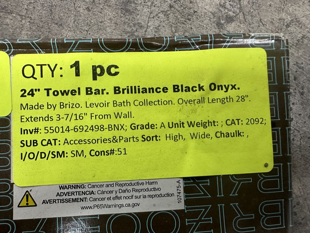24" Towel Bar Billiance Black Onyx. Made by Brizo. Levoir Bath Collection. Overall Length 28" Extends 3-7/16" From Wall Grade: A. Weight: x. Sold by: Piece. Sold as: Price X Quantity. Inventory #: 55014-692498-BNX