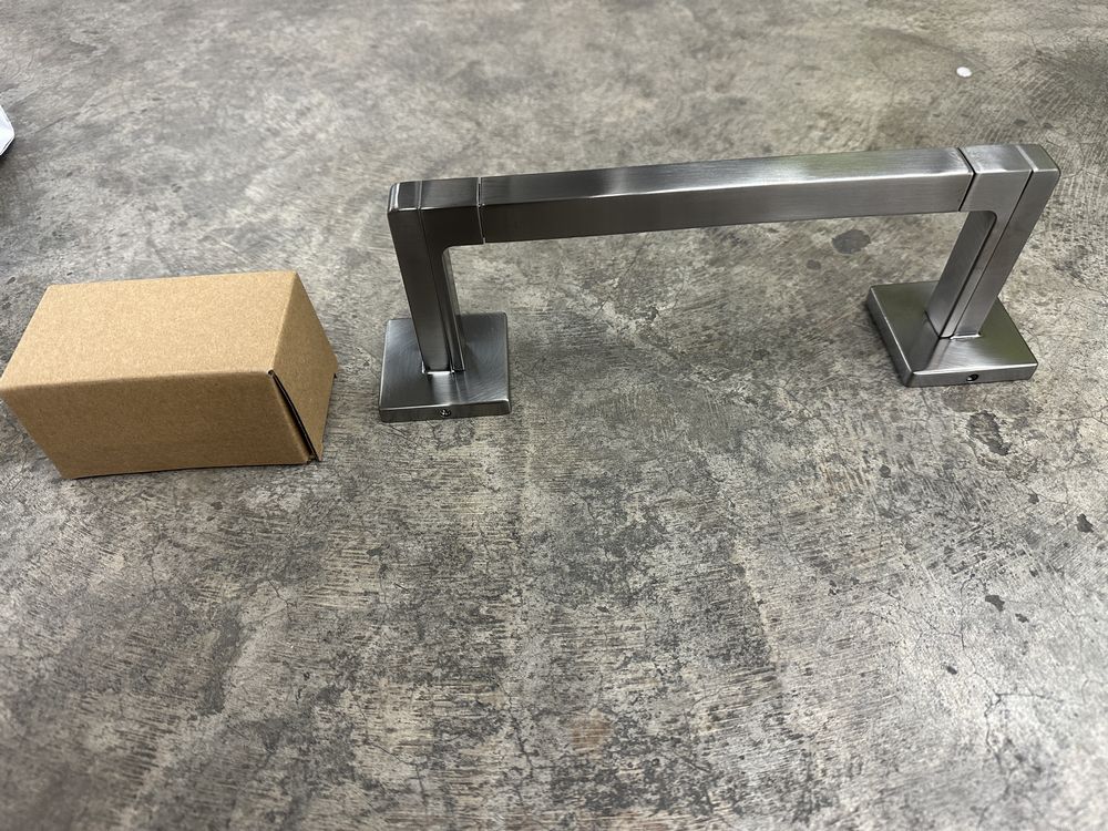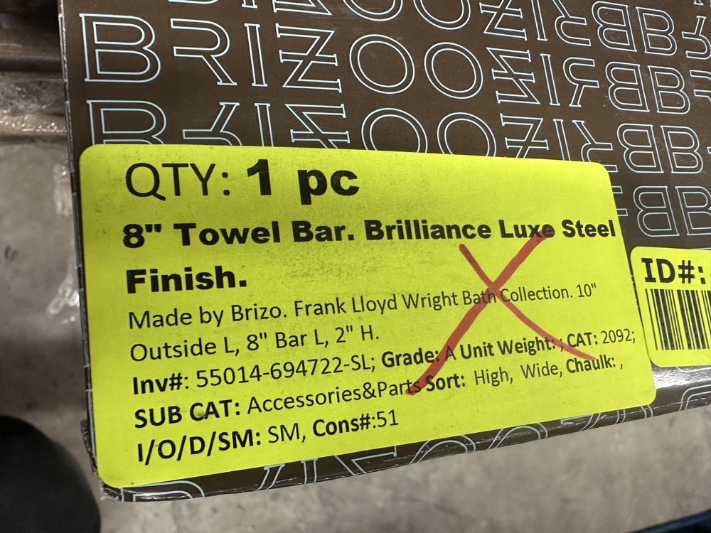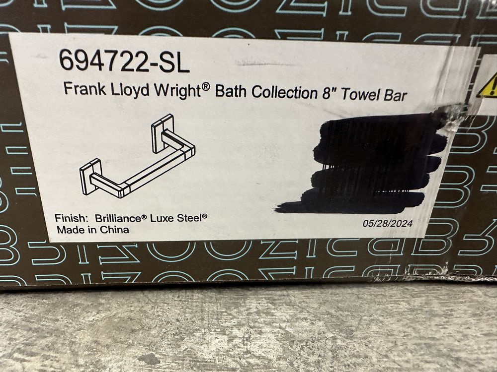 8" Towel Bar. Brilliance Luxe Steel Finish. Made By Brizo. Frank Lloyd Wright Bath Collection 10" Outter Length. 8" Bar Lenght 2" Height Grade: A. Weight: x. Sold by: Piece. Sold as: Price X Quantity. Inventory #: 55014-694722-SL